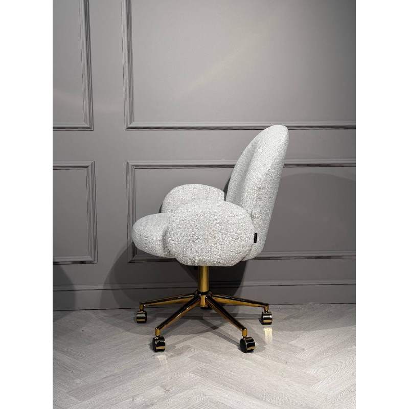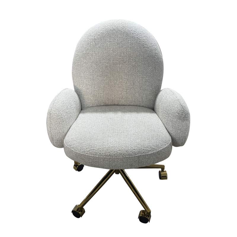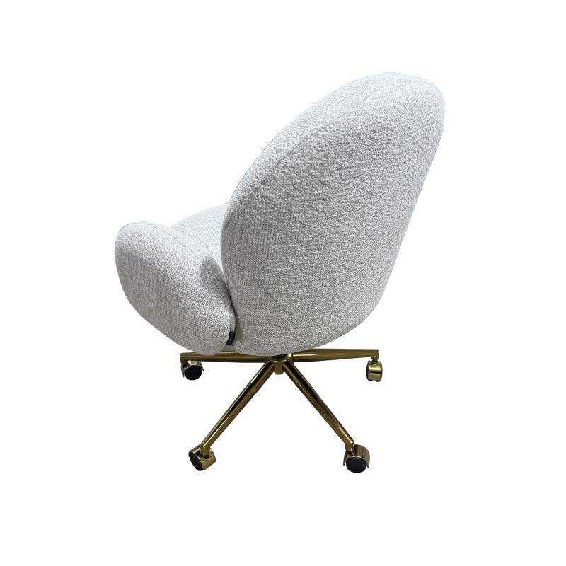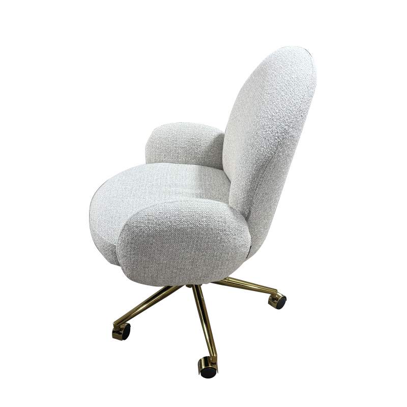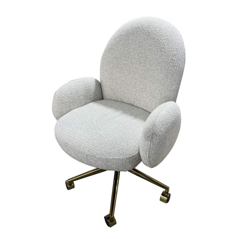 Дизайнерское мягкое офисное кресло на колесиках со спинкой и подлокотниками, с обивкой из рогожки кремового цвета и золотыми ножками