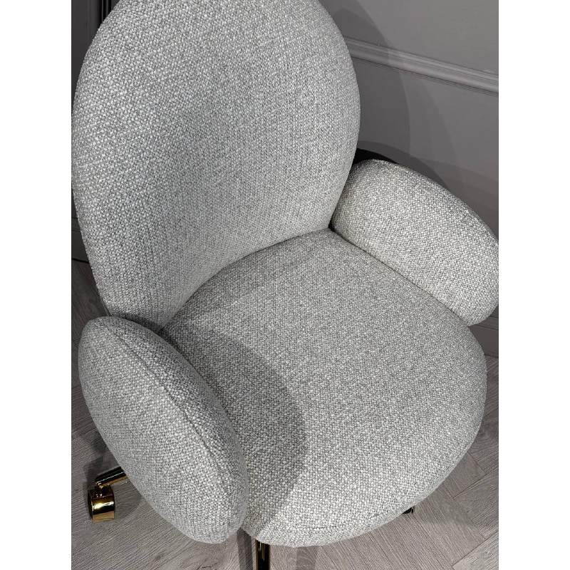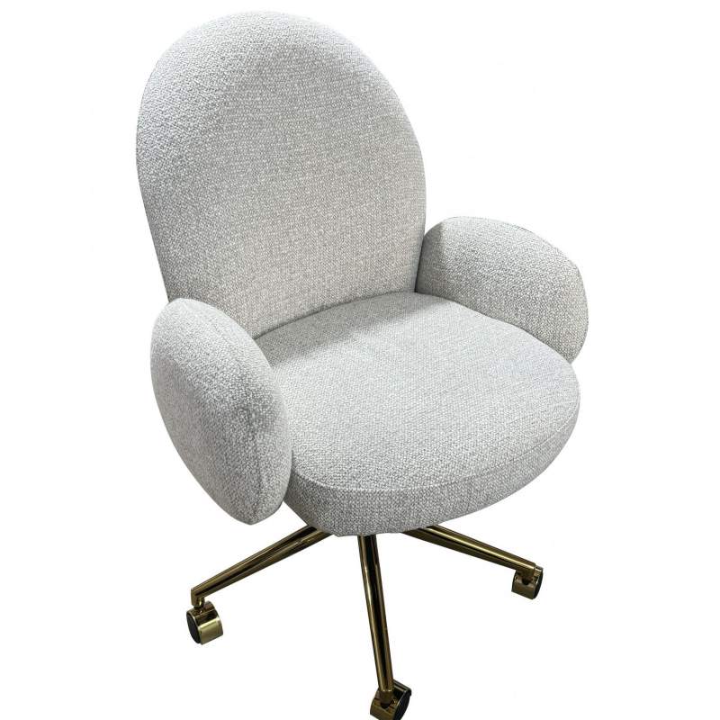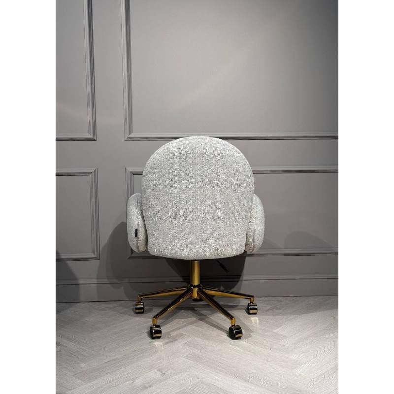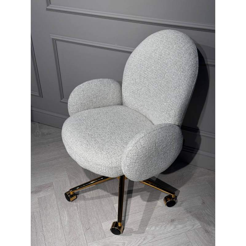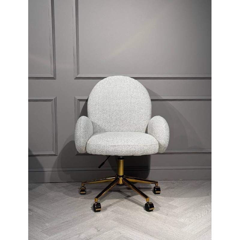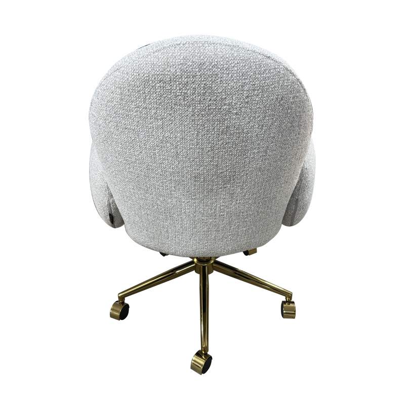 Дизайнерское мягкое офисное кресло на колесиках со спинкой и подлокотниками, с обивкой из рогожки кремового цвета и золотыми ножками