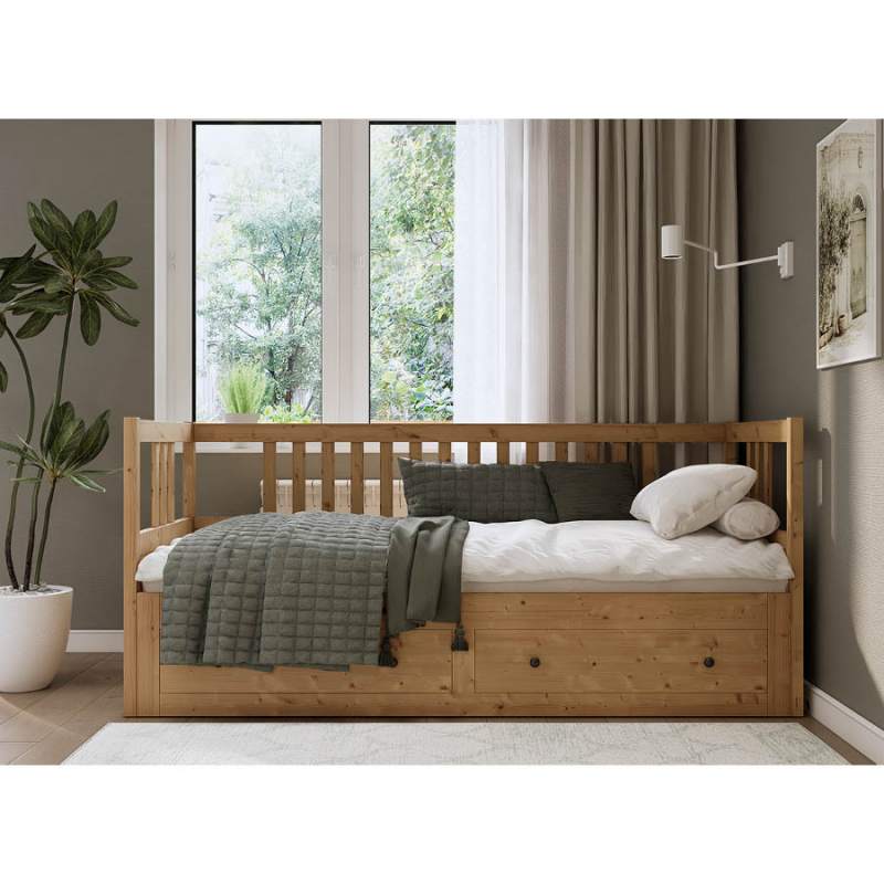 Имеет два ящика для хранения постельного белья, подушек или запасных одеял.