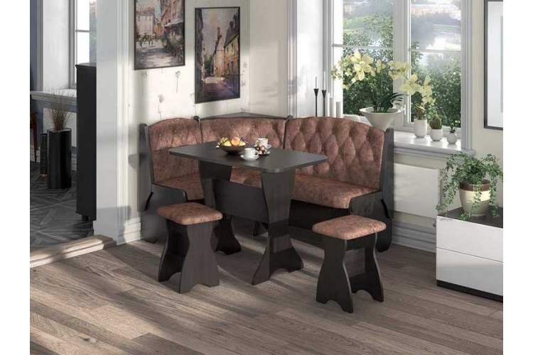 В состав набора входят: угловой диван, обеденный стол и 2 табурета.