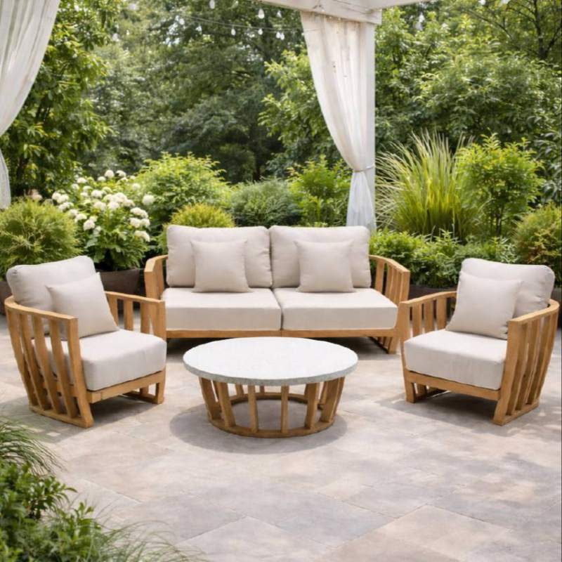 Универсальная эстетика: Теплый тон натуральной акации в сочетании с нежным бежевым цветом подушек создает спокойную, гармоничную палитру. Такой набор органично впишется в любой ландшафтный дизайн, от классического до современного.