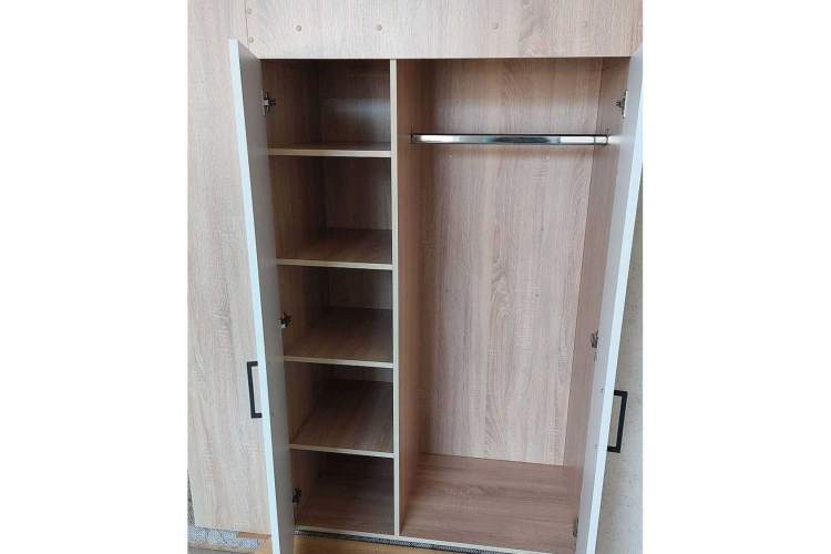 Внизу компьютерный стол с пеналом для принадлежностей и шкаф для одежды с полками и вешалкой для плечиков с одеждой.