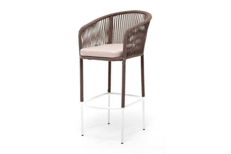 "Марсель" стул барный плетеный из роупа, каркас из стали белый муар, роуп коричневый круглый, ткань бежевая 052