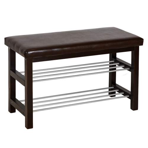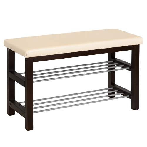Широкая двухместная банкетка с мягким сиденьем и полкой для обуви. Она сделана в незамысловатом диза..