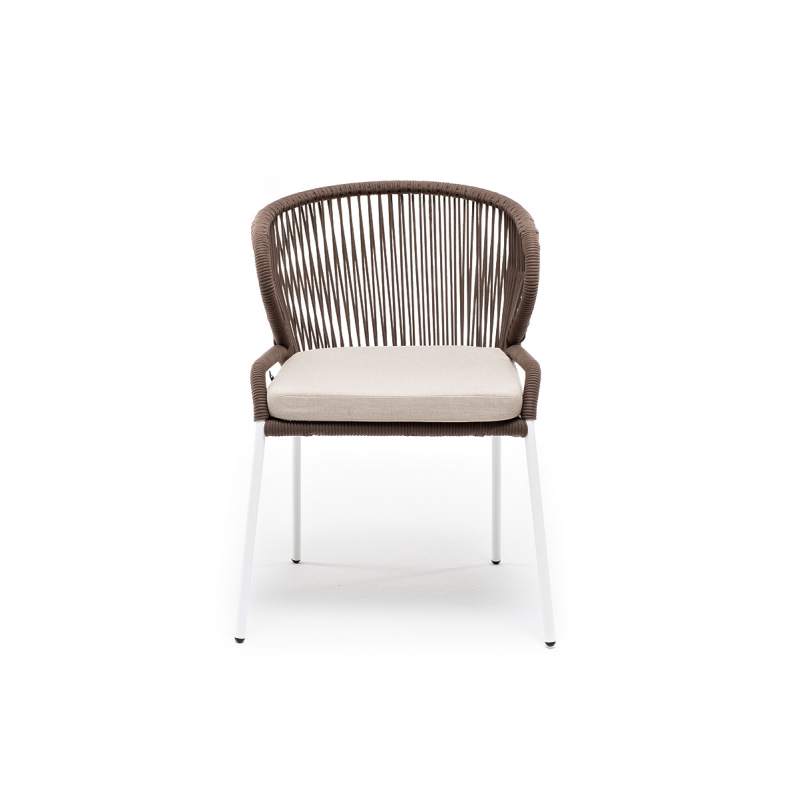 Стул «Милан» для обустройства обеденной или лаунж-зоны. Изготовлен из алюминиевого каркаса белого цвета, оплетенного вручную эластичными синтетическими лентами из высокопрочных полиэфирных волокон (роуп круглый). Цвет оплетки - коричневый. В комплект входит подушка со съёмным чехлом из 100%-го полиэстера с влагоотталкивающей пропиткой бежевого цвета. Размеры плетеного стула: 600×660×795 мм.