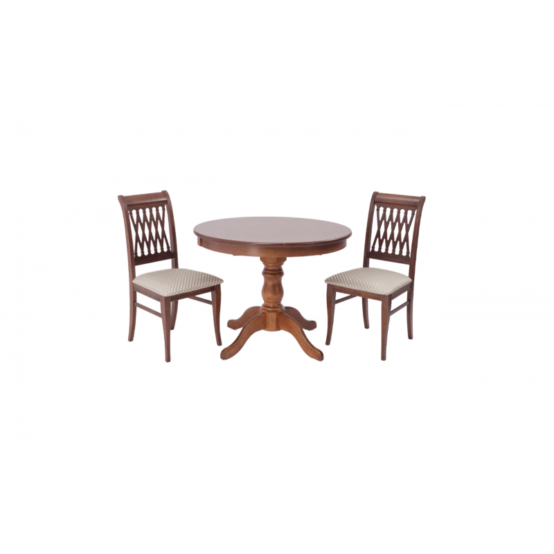 Комплект из деревянного стола Брамс на каркасе из натурального дерева и 2 стула Рич отлично подойдет к интерьеру, выдержанному в классическом стиле. Данный комплект станет центральным элементом в гостиной, столовой зоне, на кухне, позволив создать уютное обеденное место, где смогут собираться члены дружной семьи и их гости.У модели круглая форма столешницы. Такое решение исключит риск сколов и обеспечит безопасность, в том числе, детям.Комплект выполнен в красивом цвете - орех. Сочетание изысканного дизайна и высокого качества исполнения - главная особенность комплекта.Столешница выполнена из материалов с великолепными эксплуатационными свойствами - МДФ (Материал создается на основе натуральной древесины. Практичен, надежен, имеет однородную гладкую структуру), шпон.Мебель проста в уходе - для поддержания первозданного вида достаточно использовать простую чуть влажную салфетку по мере необходимости.Состав комплекта:- стол F001002W00- стулья R001402W12