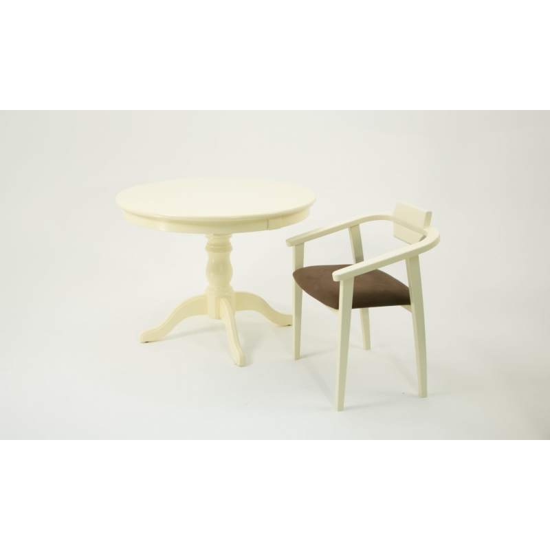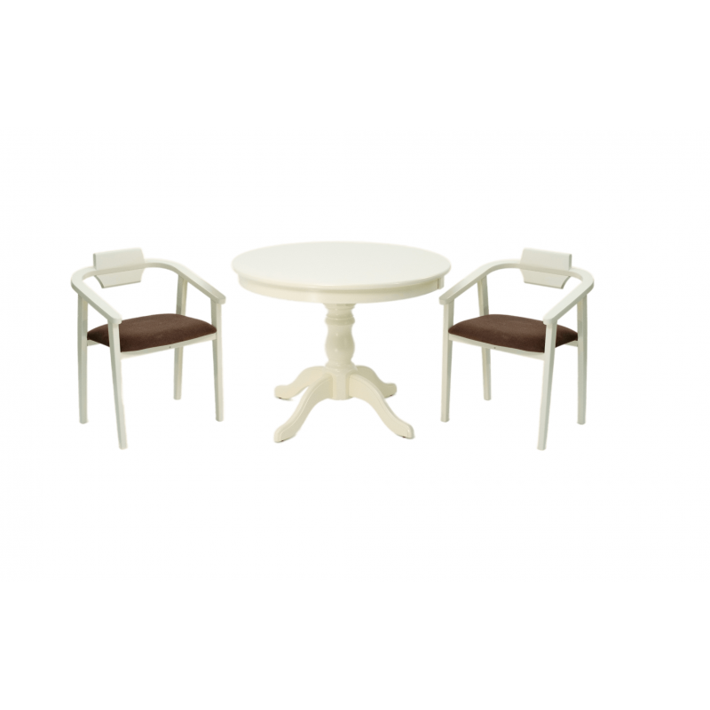 Комплект из деревянного стола Брамс на каркасе из натурального дерева и 2 стула Челси отлично подойдет к интерьеру, выдержанному в классическом стиле. Данный комплект станет центральным элементом в гостиной, столовой зоне, на кухне, позволив создать уютное обеденное место, где смогут собираться члены дружной семьи и их гости.У модели круглая форма столешницы. Такое решение исключит риск сколов и обеспечит безопасность, в том числе, детям.Комплект выполнен в красивом цвете - слоновая кость. Сочетание изысканного дизайна и высокого качества исполнения - главная особенность комплекта.Столешница выполнена из материалов с великолепными эксплуатационными свойствами - МДФ (Материал создается на основе натуральной древесины. Практичен, надежен, имеет однородную гладкую структуру), шпон.Мебель проста в уходе - для поддержания первозданного вида достаточно использовать простую чуть влажную салфетку по мере необходимости.Состав комплекта:- стол F001001S00- стулья Z011849S04