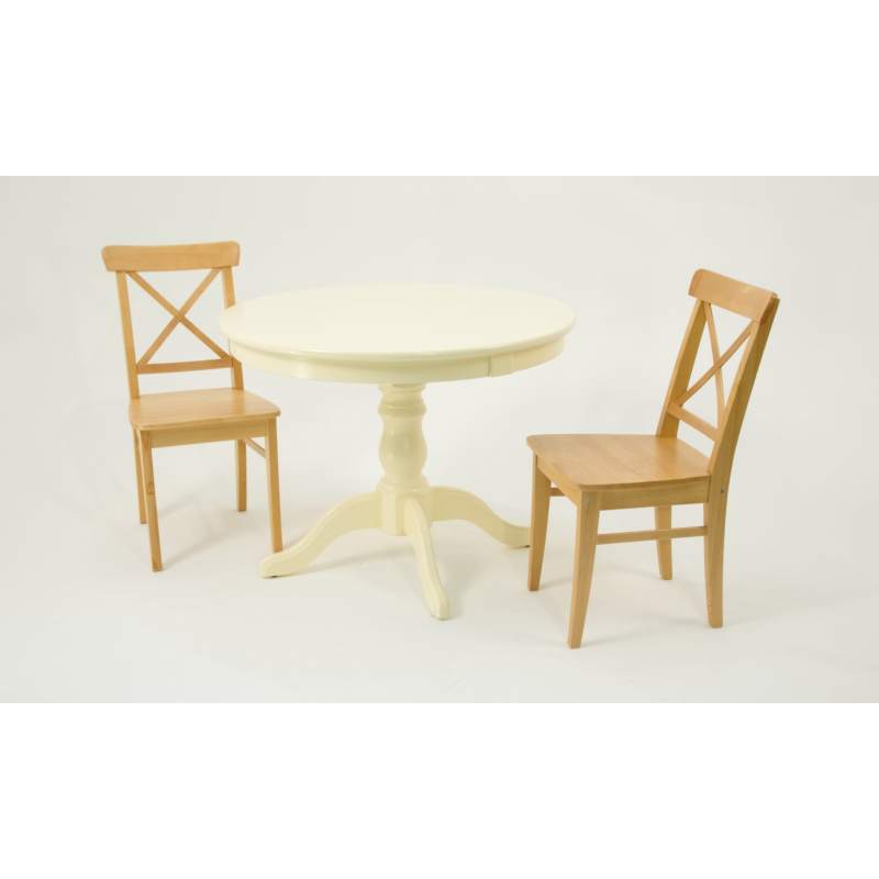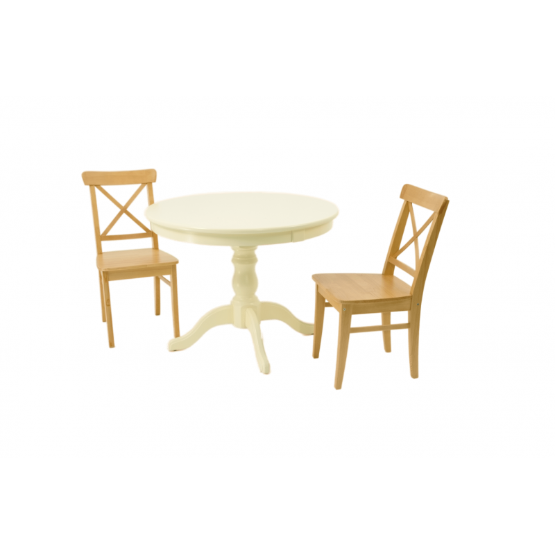 Комплект из деревянного стола Брамс на каркасе из натурального дерева и 2 стула Ингольф отлично подойдет к интерьеру, выдержанному в классическом стиле. Данный комплект станет центральным элементом в гостиной, столовой зоне, на кухне, позволив создать уютное обеденное место, где смогут собираться члены дружной семьи и их гости.У модели круглая форма столешницы. Такое решение исключит риск сколов и обеспечит безопасность, в том числе, детям.Комплект выполнен в красивой комбинации цветов - слоновая кость и натур. Сочетание изысканного дизайна и высокого качества исполнения - главная особенность комплекта.Столешница выполнена из материалов с великолепными эксплуатационными свойствами - МДФ (Материал создается на основе натуральной древесины. Практичен, надежен, имеет однородную гладкую структуру), шпон.Мебель проста в уходе - для поддержания первозданного вида достаточно использовать простую чуть влажную салфетку по мере необходимости.Состав комплекта:- стол F001001S00- стулья R100743N00