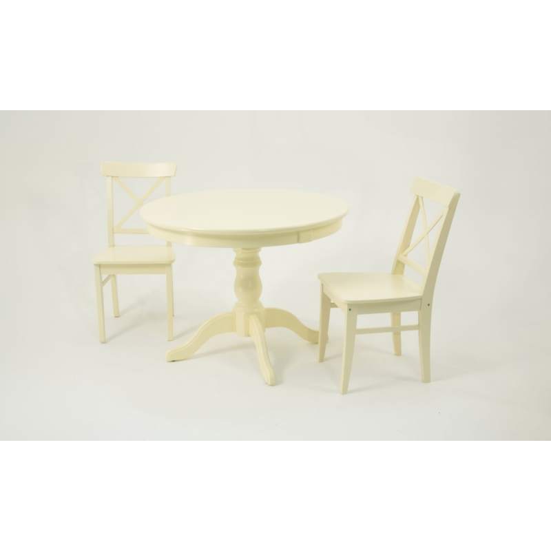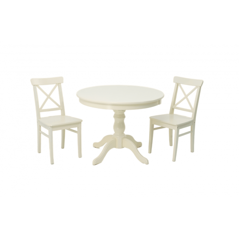 Комплект из деревянного стола Брамс на каркасе из натурального дерева и 2 стула Ингольф отлично подойдет к интерьеру, выдержанному в классическом стиле. Данный комплект станет центральным элементом в гостиной, столовой зоне, на кухне, позволив создать уютное обеденное место, где смогут собираться члены дружной семьи и их гости.У модели круглая форма столешницы. Такое решение исключит риск сколов и обеспечит безопасность, в том числе, детям.Комплект выполнен в красивом цвете - слоновая кость. Сочетание изысканного дизайна и высокого качества исполнения - главная особенность комплекта.Столешница выполнена из материалов с великолепными эксплуатационными свойствами - МДФ (Материал создается на основе натуральной древесины. Практичен, надежен, имеет однородную гладкую структуру), шпон.Мебель проста в уходе - для поддержания первозданного вида достаточно использовать простую чуть влажную салфетку по мере необходимости.Состав комплекта:- стол F001001S00- стулья R100741S00