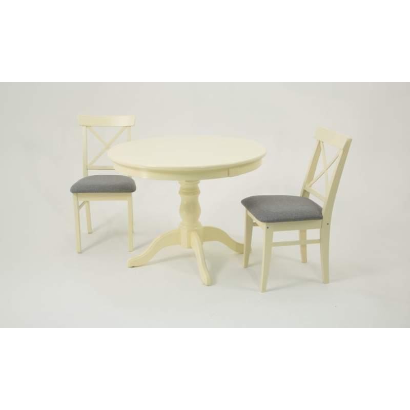 Комплект из деревянного стола Брамс на каркасе из натурального дерева и 2 стула Ингольф отлично подойдет к интерьеру, выдержанному в классическом стиле. Данный комплект станет центральным элементом в гостиной, столовой зоне, на кухне, позволив создать уютное обеденное место, где смогут собираться члены дружной семьи и их гости.У модели круглая форма столешницы. Такое решение исключит риск сколов и обеспечит безопасность, в том числе, детям.Комплект выполнен в красивом цвете - слоновая кость. Сочетание изысканного дизайна и высокого качества исполнения - главная особенность комплекта.Столешница выполнена из материалов с великолепными эксплуатационными свойствами - МДФ (Материал создается на основе натуральной древесины. Практичен, надежен, имеет однородную гладкую структуру), шпон.Мебель проста в уходе - для поддержания первозданного вида достаточно использовать простую чуть влажную салфетку по мере необходимости.Состав комплекта:- стол F001001S00- стулья R101753S01