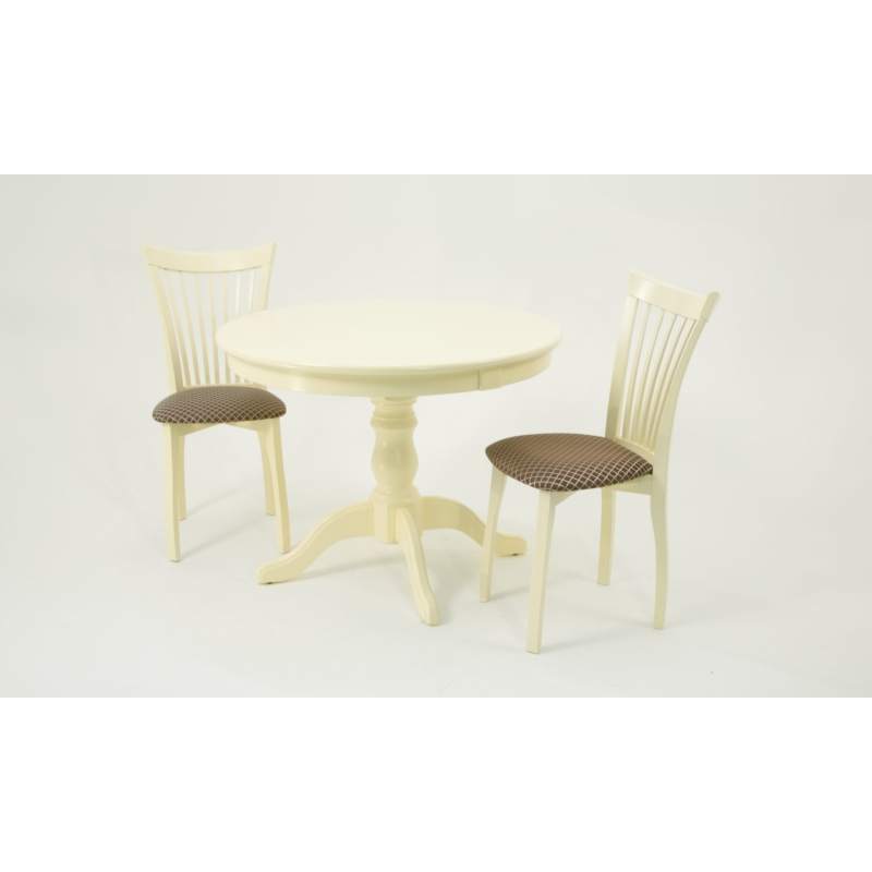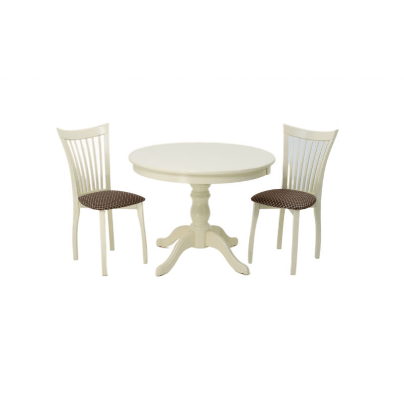 Комплект из деревянного стола Брамс на каркасе из натурального дерева и 2 стула Миранда отлично подойдет к интерьеру, выдержанному в классическом стиле. Данный комплект станет центральным элементом в гостиной, столовой зоне, на кухне, позволив создать уютное обеденное место, где смогут собираться члены дружной семьи и их гости.У модели круглая форма столешницы. Такое решение исключит риск сколов и обеспечит безопасность, в том числе, детям.Комплект выполнен в красивом цвете - слоновая кость. Сочетание изысканного дизайна и высокого качества исполнения - главная особенность комплекта.Столешница выполнена из материалов с великолепными эксплуатационными свойствами - МДФ (Материал создается на основе натуральной древесины. Практичен, надежен, имеет однородную гладкую структуру), шпон.Мебель проста в уходе - для поддержания первозданного вида достаточно использовать простую чуть влажную салфетку по мере необходимости.Состав комплекта:- стол F001001S00- стулья R001443S14