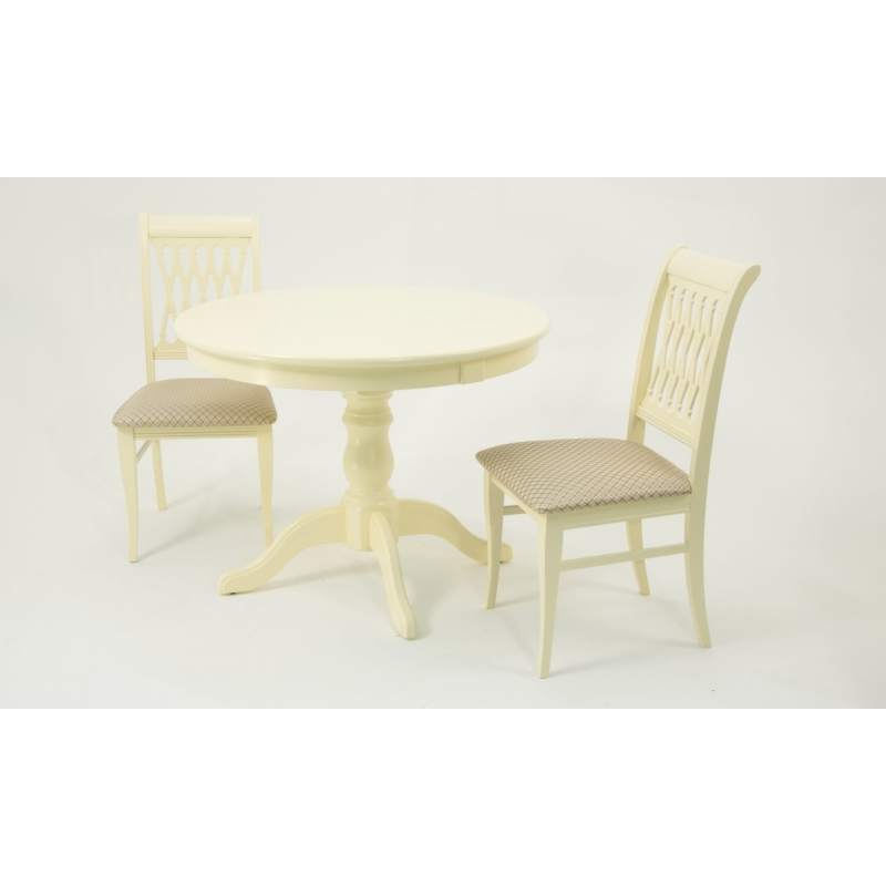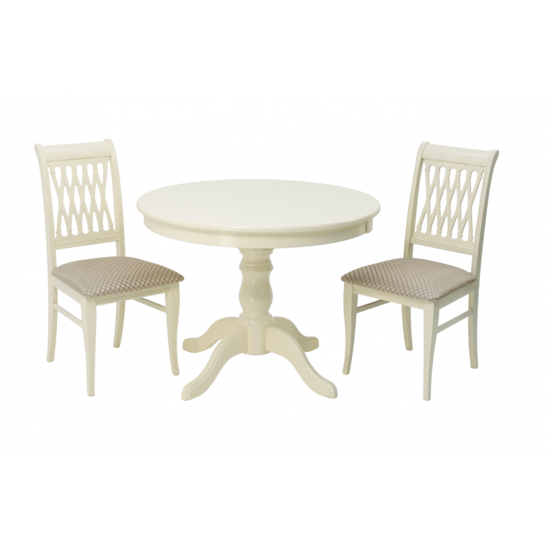 Комплект из деревянного стола Брамс на каркасе из натурального дерева и 2 стула Рич отлично подойдет к интерьеру, выдержанному в классическом стиле. Данный комплект станет центральным элементом в гостиной, столовой зоне, на кухне, позволив создать уютное обеденное место, где смогут собираться члены дружной семьи и их гости.У модели круглая форма столешницы. Такое решение исключит риск сколов и обеспечит безопасность, в том числе, детям.Комплект выполнен в красивом цвете - слоновая кость. Сочетание изысканного дизайна и высокого качества исполнения - главная особенность комплекта.Столешница выполнена из материалов с великолепными эксплуатационными свойствами - МДФ (Материал создается на основе натуральной древесины. Практичен, надежен, имеет однородную гладкую структуру), шпон.Мебель проста в уходе - для поддержания первозданного вида достаточно использовать простую чуть влажную салфетку по мере необходимости.Состав комплекта:- стол F001001S00- стулья R001401S12