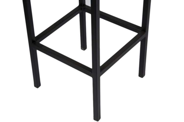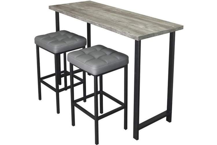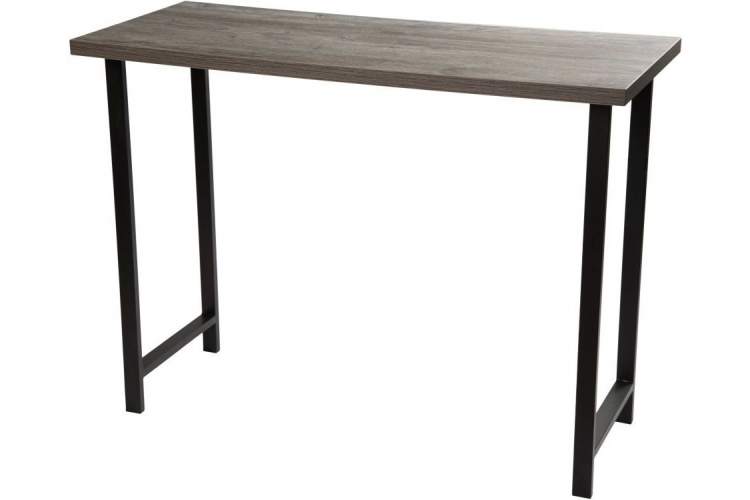 Обеденная группа, состоящая из нераскладного стола «Консоль барная» ЛДСП «Сосна Пасадена», ножки черный металл и 2-х полубарных стульев «Камелот», исполненных с сиденьем в обивке кожзам Темно-серый, с каркасом черный матовый — изготовленной С. Петербургской мебельной фабрикой «Древпром».