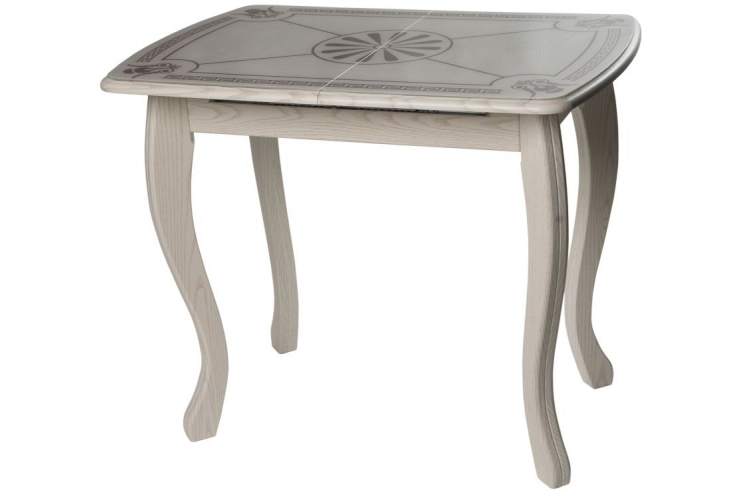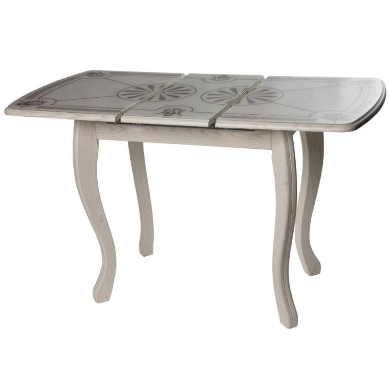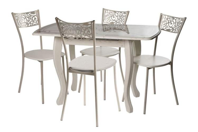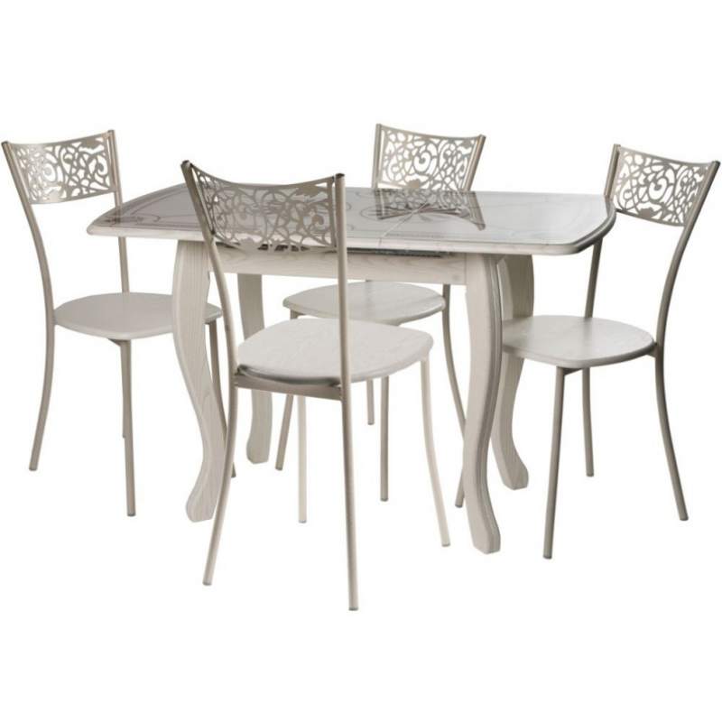 Обеденная группа, состоящая из стола «Альба мини» Инкрустация-2, Патина 25, ножки МДФ - тип 2 и 4-х стульев «Эрго», исполненных с сиденьем МДФ патина 27, с каркасом белый антик — изготовленной С. Петербургской мебельной фабрикой «Древпром».
