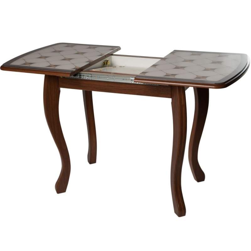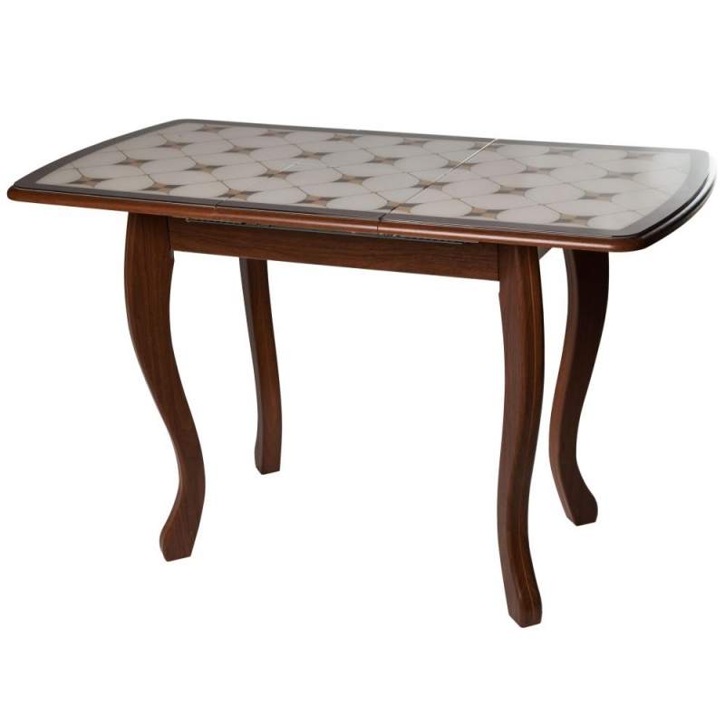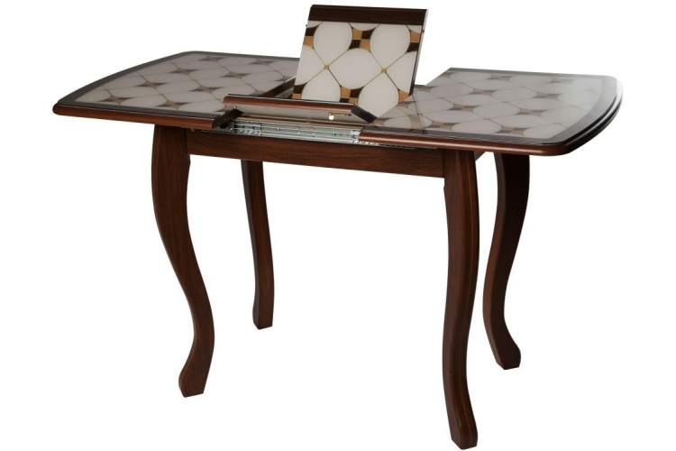 Обеденная группа, состоящая из стола «Альба мини» Инкрустация плитка, мореная береза, ножки МДФ - тип 2 и 4-х стульев «Кемпер», исполненных с сиденьем в обивке Линкольн бежевый, с каркасом Арабискат — изготовленной С. Петербургской мебельной фабрикой «Древпром».