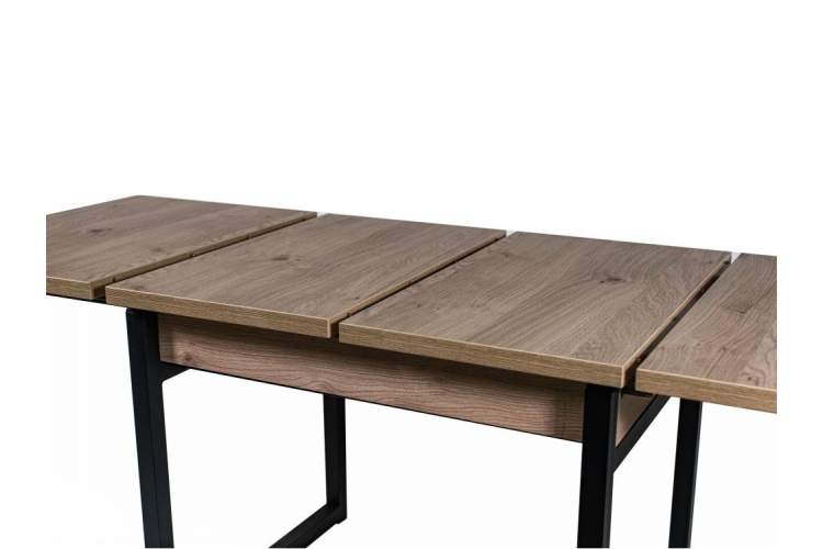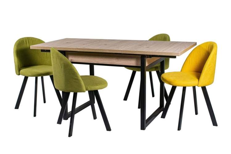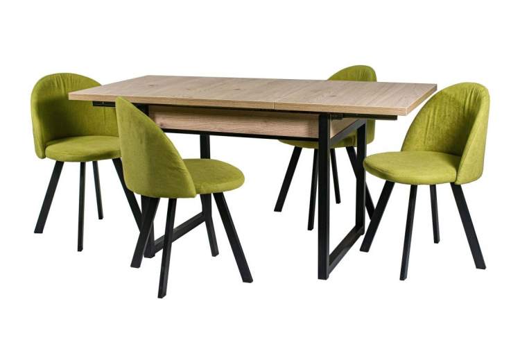 Обеденная группа, состоящая из раскладного стола «Арт» ЛДСП «Эврика», ножки черный металл и 4-х стульев «Спайдер», исполненных с сиденьем в обивке Канди Олива, с черным каркасом — изготовленной С. Петербургской мебельной фабрикой «Древпром».