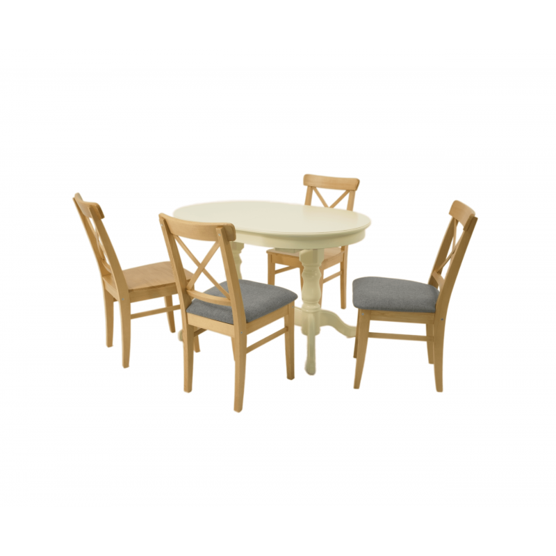 Комплект из деревянного стола Бизе на каркасе из натурального дерева и 4 стула Ингольф отлично подойдет к интерьеру, выдержанному в классическом стиле. Данный комплект станет центральным элементом в гостиной, столовой зоне, на кухне, позволив создать уютное обеденное место, где смогут собираться члены дружной семьи и их гости.У модели овальная форма столешницы. Такое решение исключит риск сколов и обеспечит безопасность, в том числе, детям.Комплект выполнен в красивой комбинации цветов - слоновая кость и натуральный. Сочетание изысканного дизайна и высокого качества исполнения - главная особенность комплекта.Столешница выполнена из материалов с великолепными эксплуатационными свойствами - МДФ (Материал создается на основе натуральной древесины. Практичен, надежен, имеет однородную гладкую структуру), шпон.Мебель проста в уходе - для поддержания первозданного вида достаточно использовать простую чуть влажную салфетку по мере необходимости.Состав комплекта:- стол F212020S00- стулья R101752N01