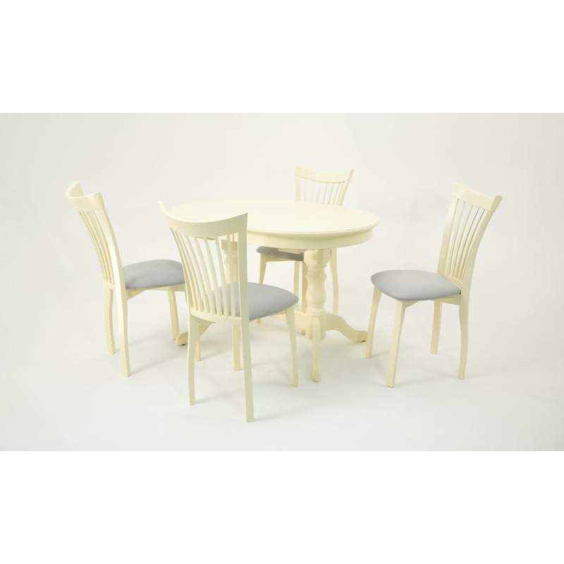Комплект из деревянного стола Бизе на каркасе из натурального дерева и 4 стула Миранда отлично подойдет к интерьеру, выдержанному в классическом стиле. Данный комплект станет центральным элементом в гостиной, столовой зоне, на кухне, позволив создать уютное обеденное место, где смогут собираться члены дружной семьи и их гости.У модели овальная форма столешницы. Такое решение исключит риск сколов и обеспечит безопасность, в том числе, детям.Комплект выполнен в красивом цвете - слоновая кость. Сочетание изысканного дизайна и высокого качества исполнения - главная особенность комплекта.Столешница выполнена из материалов с великолепными эксплуатационными свойствами - МДФ (Материал создается на основе натуральной древесины. Практичен, надежен, имеет однородную гладкую структуру), шпон.Мебель проста в уходе - для поддержания первозданного вида достаточно использовать простую чуть влажную салфетку по мере необходимости.Состав комплекта:- стол F212020S00- стулья R001441S01