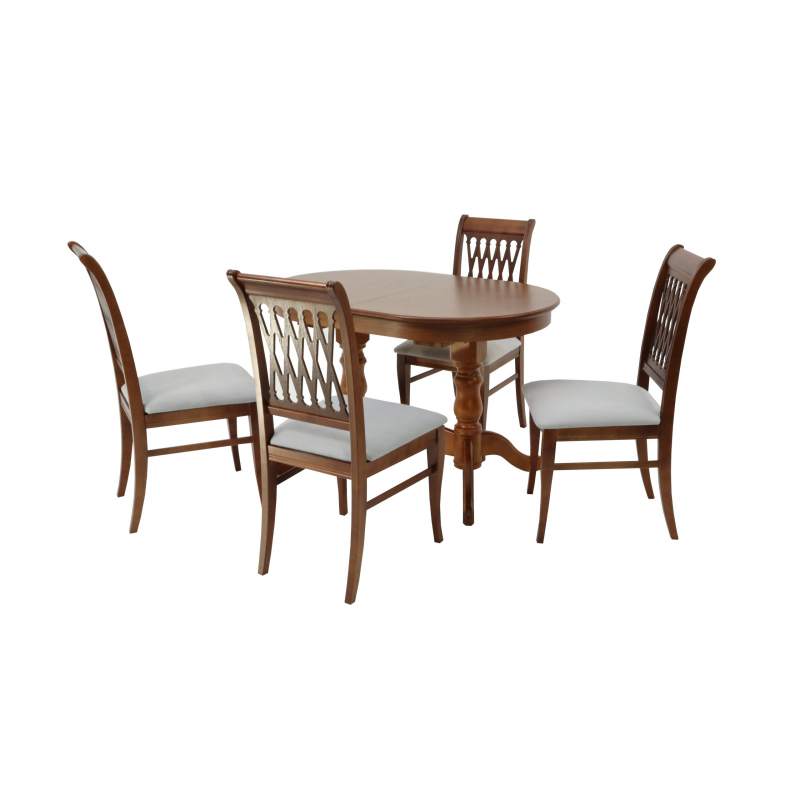 Комплект из деревянного стола Бизе на каркасе из натурального дерева и 4 стула Рич отлично подойдет к интерьеру, выдержанному в классическом стиле. Данный комплект станет центральным элементом в гостиной, столовой зоне, на кухне, позволив создать уютное обеденное место, где смогут собираться члены дружной семьи и их гости.У модели овальная форма столешницы. Такое решение исключит риск сколов и обеспечит безопасность, в том числе, детям.Комплект выполнен в красивом цвете - орех. Сочетание изысканного дизайна и высокого качества исполнения - главная особенность комплекта.Столешница выполнена из материалов с великолепными эксплуатационными свойствами - МДФ (Материал создается на основе натуральной древесины. Практичен, надежен, имеет однородную гладкую структуру), шпон.Мебель проста в уходе - для поддержания первозданного вида достаточно использовать простую чуть влажную салфетку по мере необходимости.Состав комплекта:- стол F212021W00- стулья R001400W01