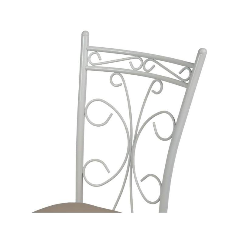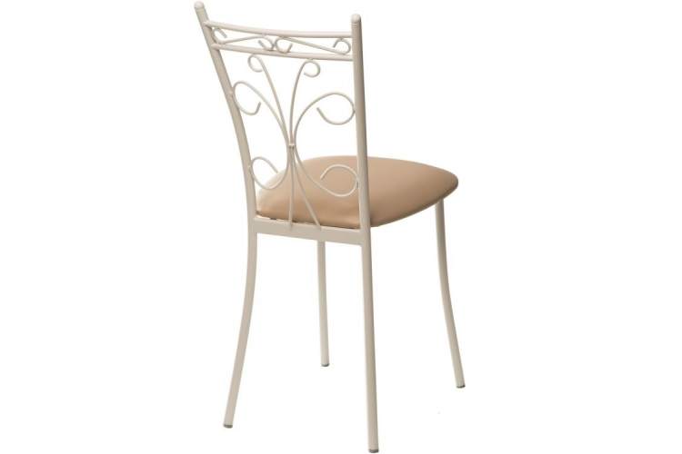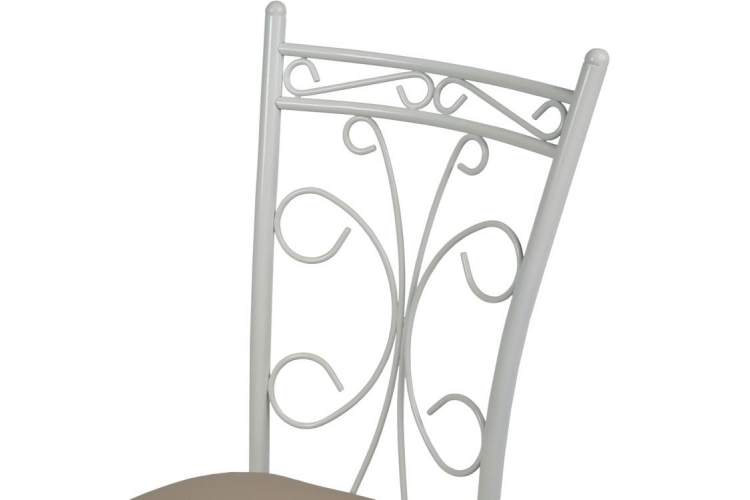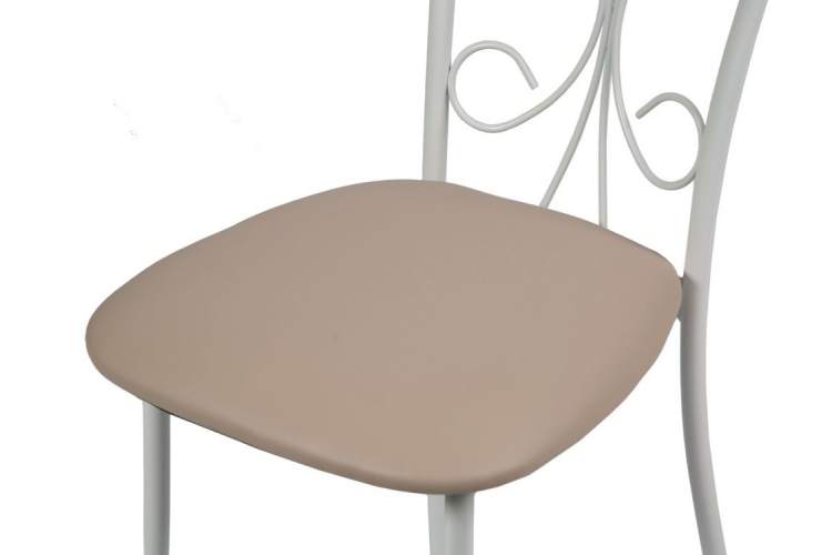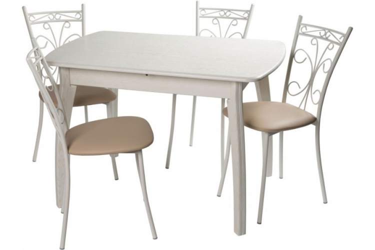 Обеденная группа, состоящая из нераскладного стола «Верона» МДФ (тип 1) патина 27 и 4-х стульев «Неаполь», исполненных с сиденьем в обивке Линкольн бежевый, с белым каркасом — изготовленной С. Петербургской мебельной фабрикой «Древпром».