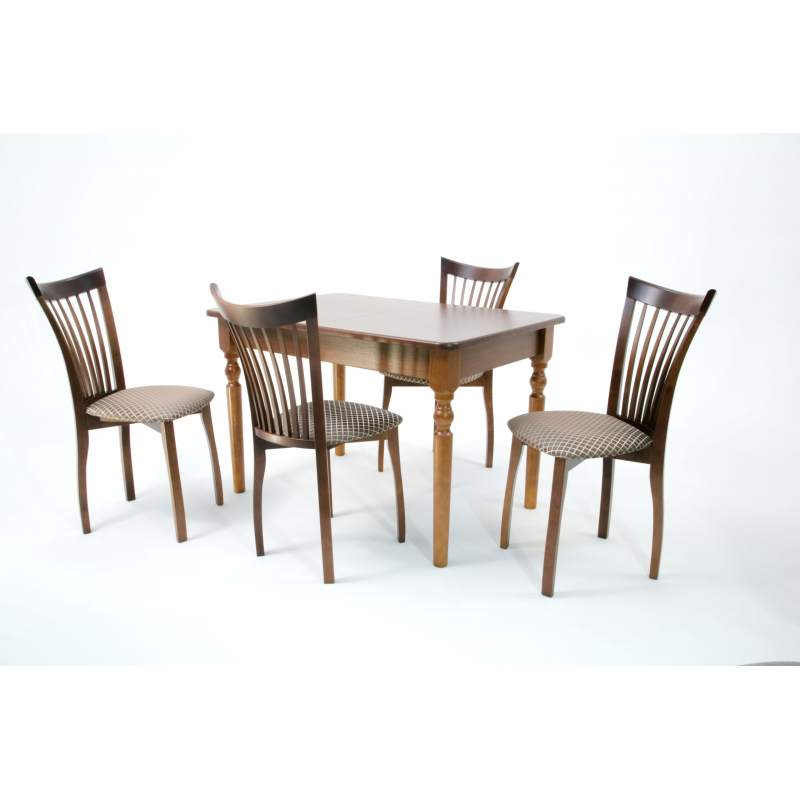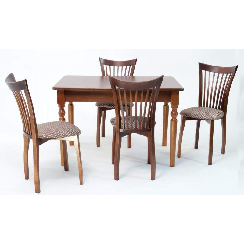 Комплект из деревянного стола Верди на каркасе из натурального дерева и 4 стульев Миранда отлично подойдет к интерьеру, выдержанному в классическом или софременном стиле. Данный комплект станет центральным элементом в гостиной, столовой зоне, на кухне, позволив создать уютное обеденное место, где смогут собираться члены дружной семьи и их гости.У модели скругленные углы столешницы. Такое решение исключит риск сколов и обеспечит безопасность, в том числе, детям.Комплект выполнен в красивом цвете - орех. Сочетание изысканного дизайна и высокого качества исполнения - главная особенность комплекта.Столешница выполнена из материалов с великолепными эксплуатационными свойствами - МДФ (Материал создается на основе натуральной древесины. Практичен, надежен, имеет однородную гладкую структуру), шпон.Мебель проста в уходе - для поддержания первозданного вида достаточно использовать простую чуть влажную салфетку по мере необходимости.