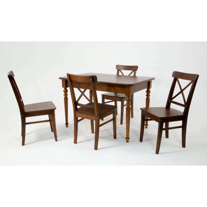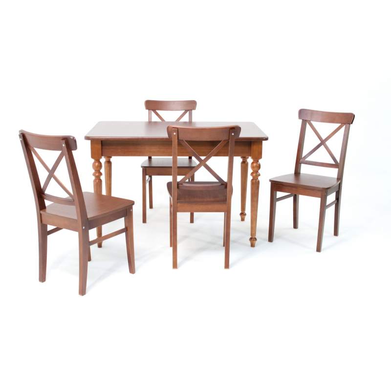 Комплект из деревянного стола Вивальди на каркасе из натурального дерева и 4 стульев Ингольф отлично подойдет к интерьеру, выдержанному в классическом или софременном стиле. Данный комплект станет центральным элементом в гостиной, столовой зоне, на кухне, позволив создать уютное обеденное место, где смогут собираться члены дружной семьи и их гости.У модели скругленные углы столешницы. Такое решение исключит риск сколов и обеспечит безопасность, в том числе, детям.Комплект выполнен в красивом цвете - орех. Сочетание изысканного дизайна и высокого качества исполнения - главная особенность комплекта.Столешница выполнена из материалов с великолепными эксплуатационными свойствами - МДФ (Материал создается на основе натуральной древесины. Практичен, надежен, имеет однородную гладкую структуру), шпон.Мебель проста в уходе - для поддержания первозданного вида достаточно использовать простую чуть влажную салфетку по мере необходимости.