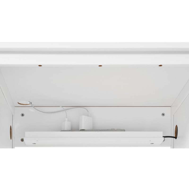 Продуманный кабель-менеджмент — полка для удлинителя под столешницей и отверстия для кабелей в столешнице и тумбах.