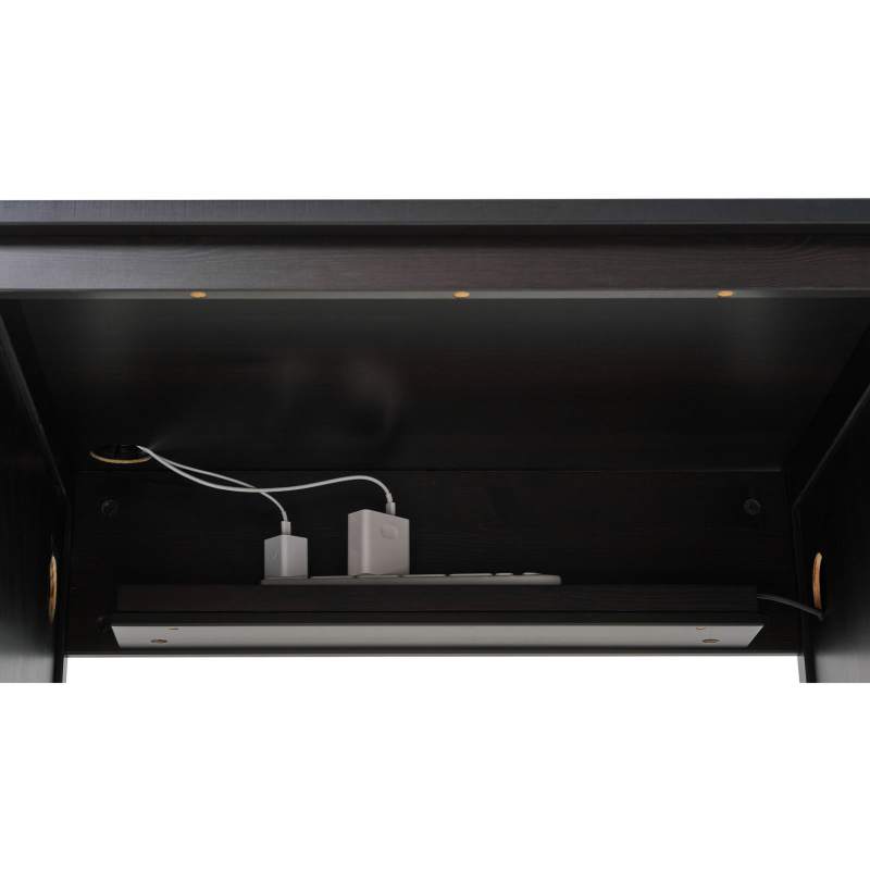 Продуманный кабель-менеджмент — полка для удлинителя под столешницей и отверстия для кабелей в столешнице и тумбах.