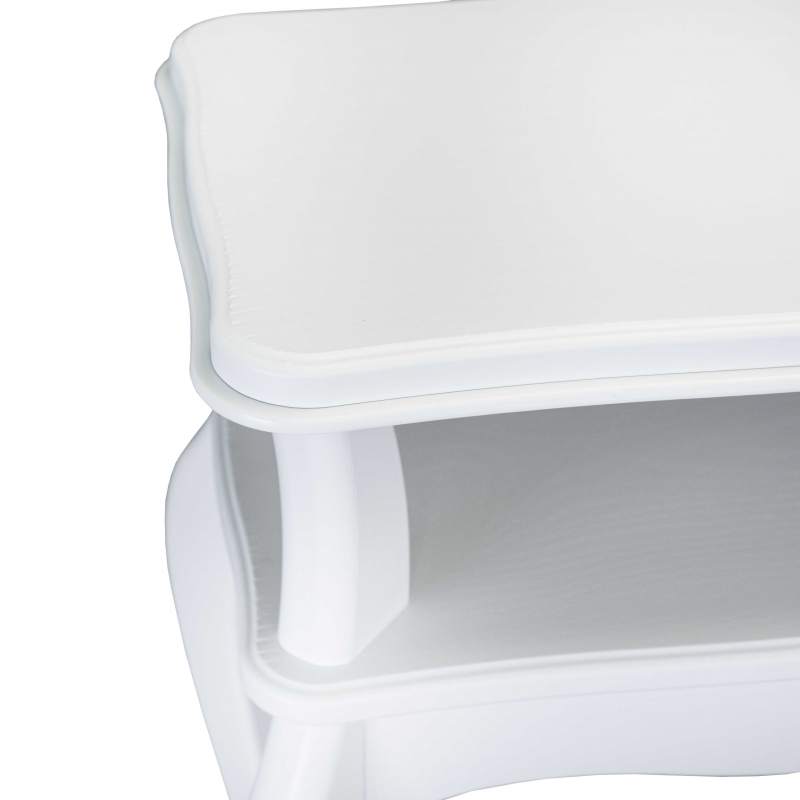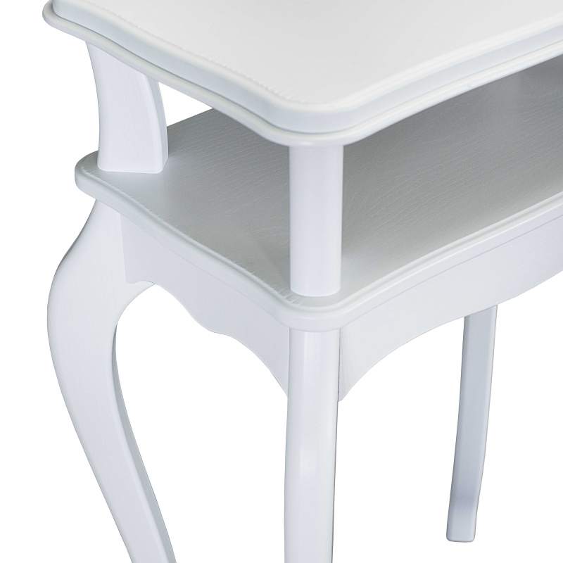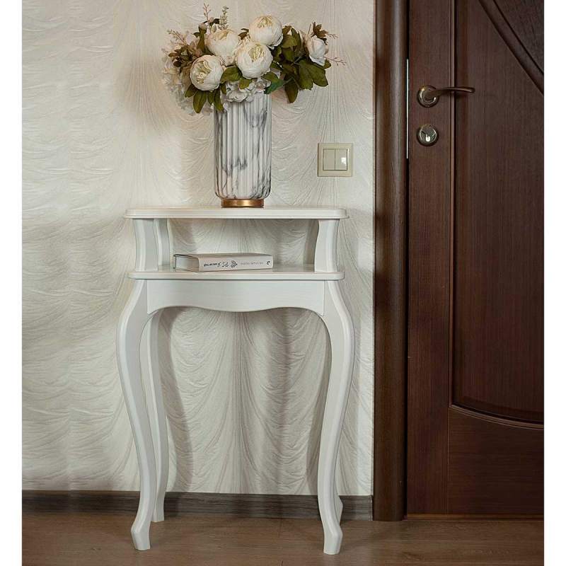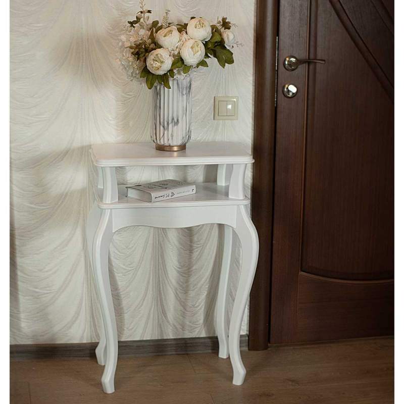 Сдержанный дизайн предмета мебели крайне эстетичен. Углы подставки сглажены, ножки изящно изогнуты. Кромку столешницы украшает аккуратный рельеф.