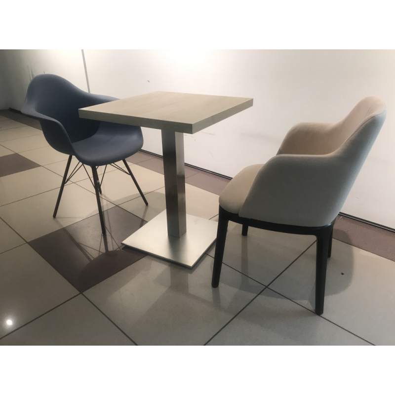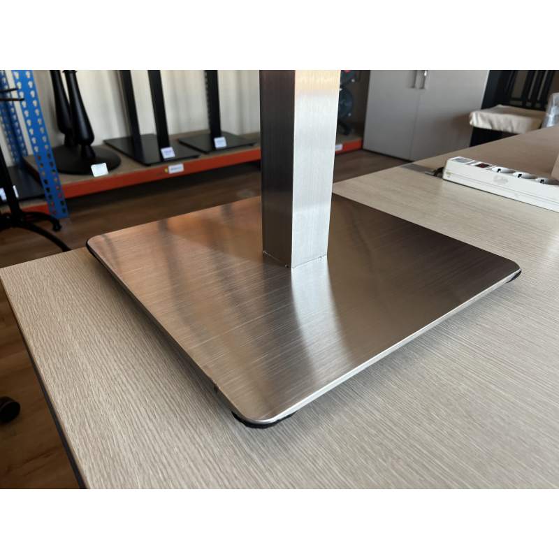 Подстолье 4111 из нержавеющей стали с большим квадратным основанием 45х45 см. В отличие от хромированных подстолий на нержавейке не так заметны разводы и пятна. Преимущество станет явным зимой, когда тающий снег от обуви гостей вашего ресторана будет оставаться на основании подстолья. Поверхность металла часто называют quot;сатинированнойquot;, она имеет не зеркальный, а именно матовый металлический блеск, что выглядит намного благороднее.Есть более недорогой аналог этого подстолья: подстолье 4110