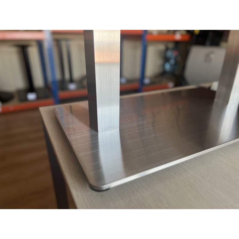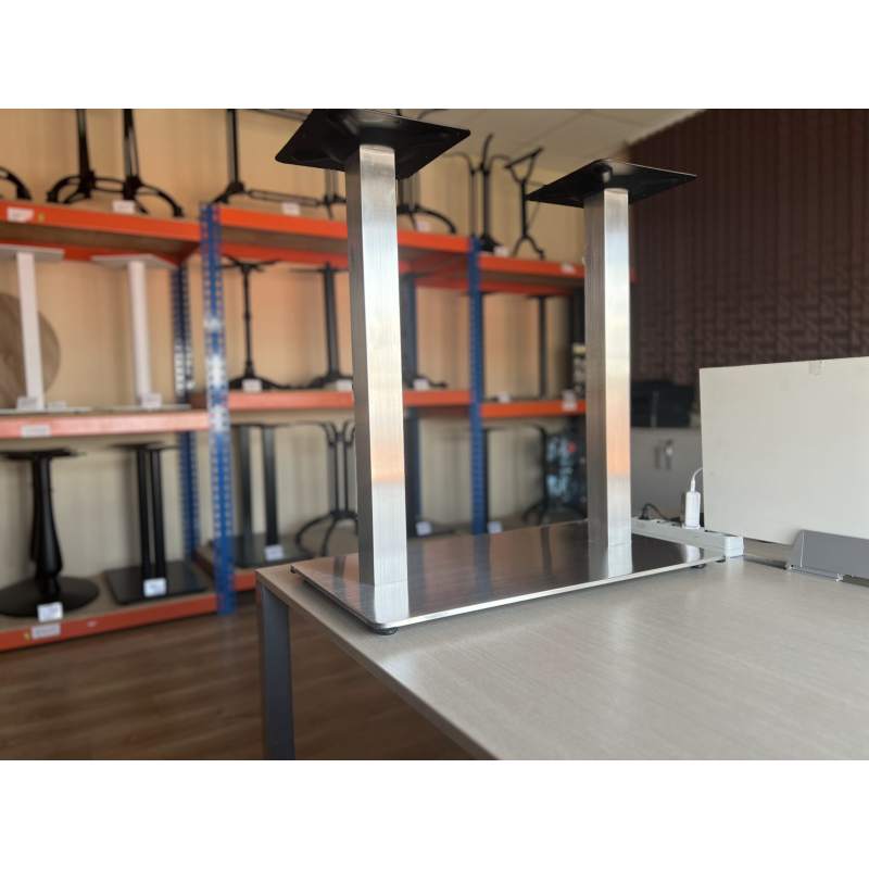 Двойное подстолье 4116 из нержавеющей стали с прямоугольным основанием и квадратными стойками (не круглые!). Матовая, сатинированная поверхность подстолья имеет не зеркальный, а холодный, металлический блеск. В отличие от хромированного на такой поверхности не так заметны пятна и разводы.Обращайте внимание на массу - более 20 кг, поэтому устойчивое. На рынке встречаются более легкие аналоги, а здесь важен каждый килограмм.У этого подстолья есть четыре одинарных компаньона в разных размерах и с квадратным, и круглым основаниеми: подстолье 4110 и с круглым основанием: подстолье 4105