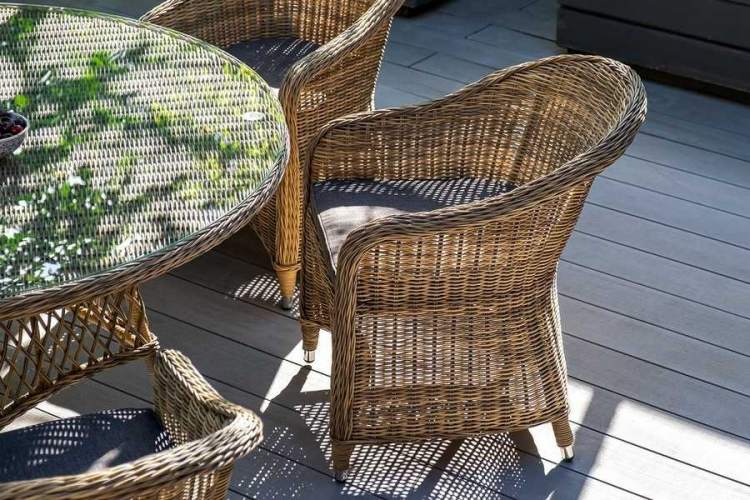 Кресло для сада из искусственного ротанга из коллекции «Равенна» станет поистине украшением вашего сада, веранды или террасы. Его можно использовать в помещении и на улице. Кресло изготовлено посредством ручного плетения и выполнено из круглого искусственного ротанга соломенного цвета. Для укрепления конструкции использован алюминиевый каркас. Благодаря ему плетеное кресло остается легким, но прочным. Оно способно выдержать до 150 кг. Размеры: 680×570×810 мм. В комплект включена серая подушка со съемным чехлом из полиэстера, который обработан влагоотталкивающими пропитками. Чехол можно стирать.
