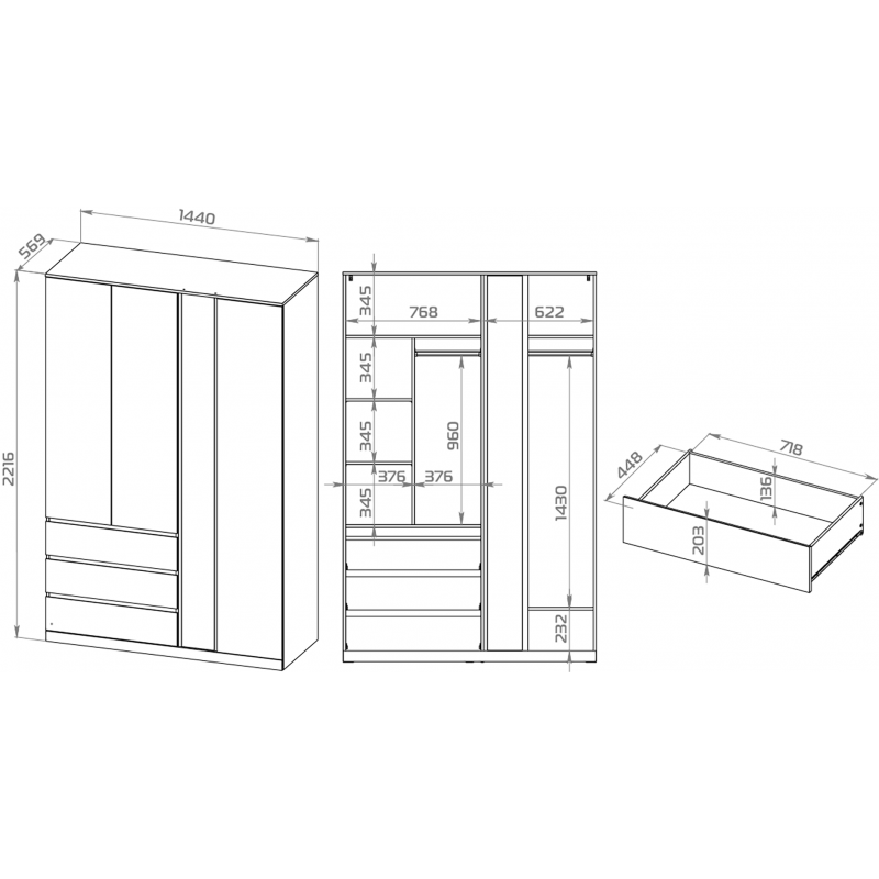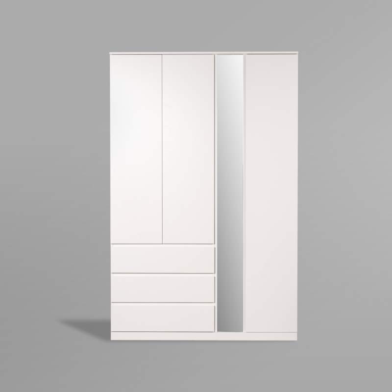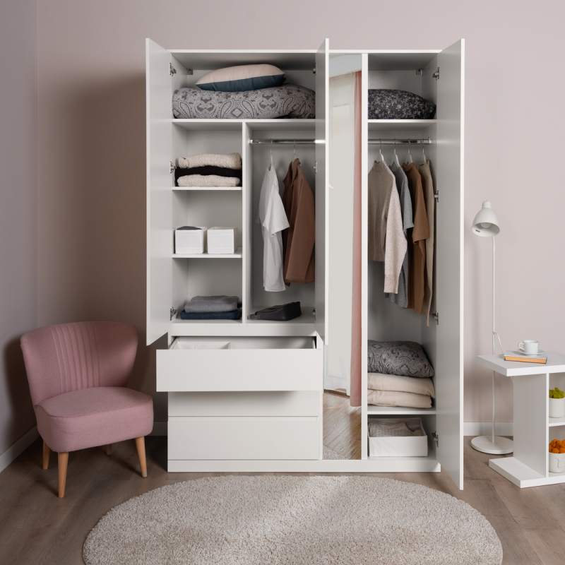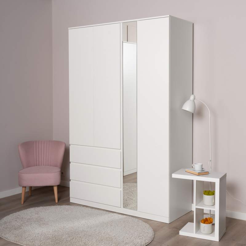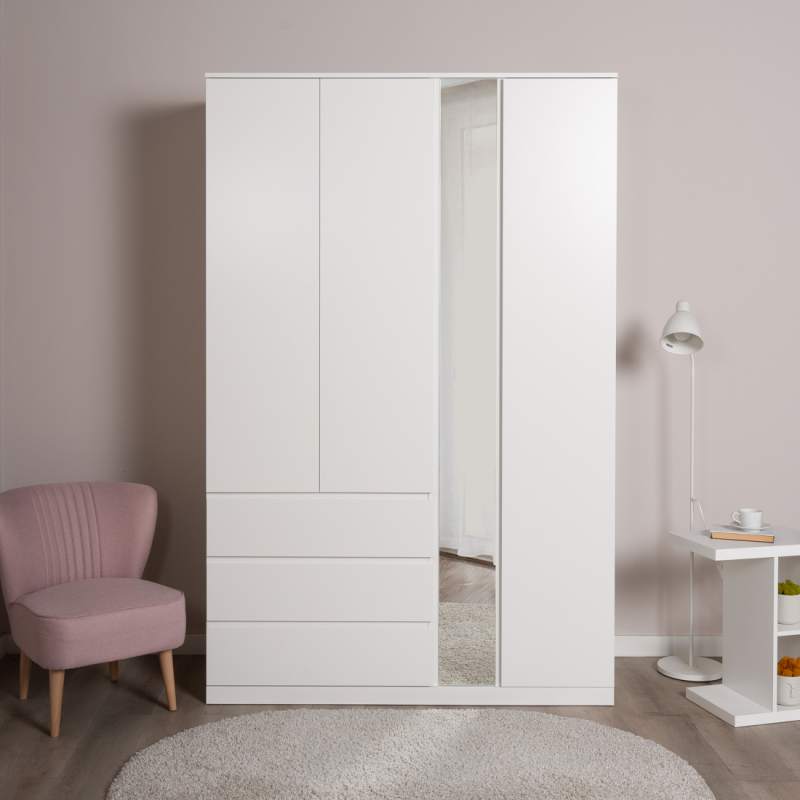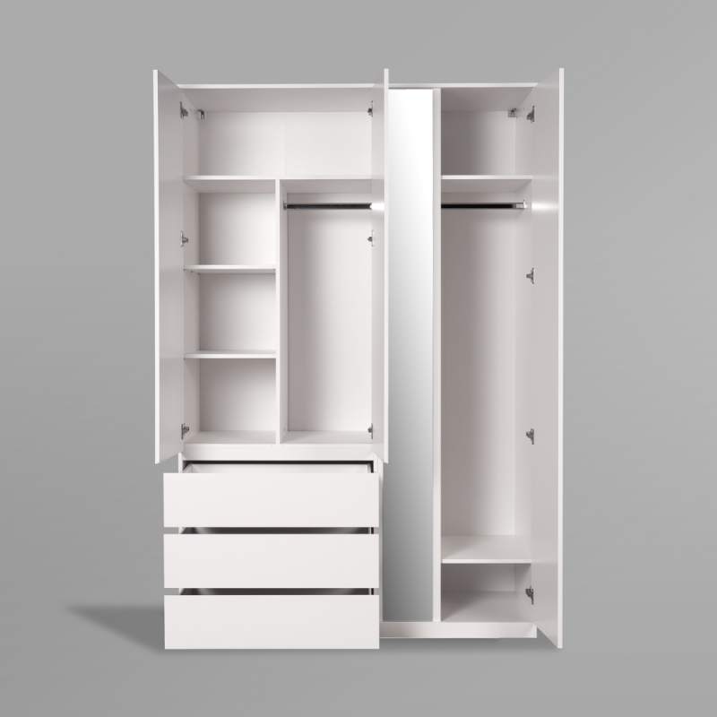 Шкаф Варма Стор 144: вместительный шкаф шириной 1440 мм из серии шкафов ВАРМА СТОР. Выполнен в классическом строгом белом дизайне с ручками скрытого типа. 3 распашных фасада, 3 выдвижных ящика и одна зеркальная секция, оснащен 2-мя гардеробными штангами.