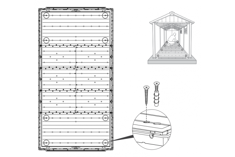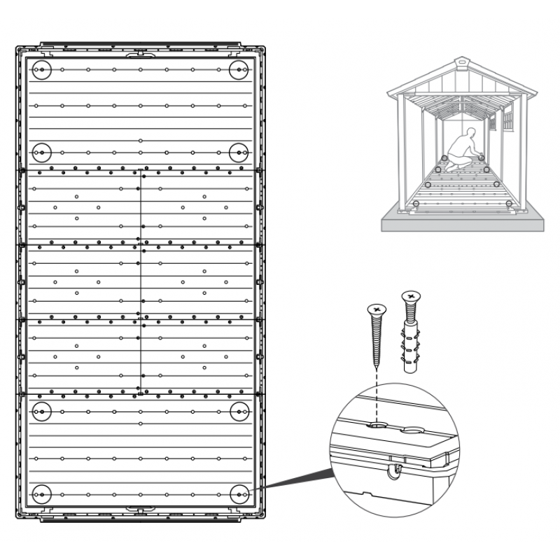 Сборка дома обязательна с использованием соответствующих шурупов с постоянным креплением к земле в специально отведенных местах на полу дома (шурупы в комплект не входят). Тип и размер крепежных винтов или анкеров зависят от модели дома, типа и типа подготовленного основания, например, бетонного (бетонная стяжка, брусчатка), деревянного (ОСБ-плита, деревянные плиты) и т. д.