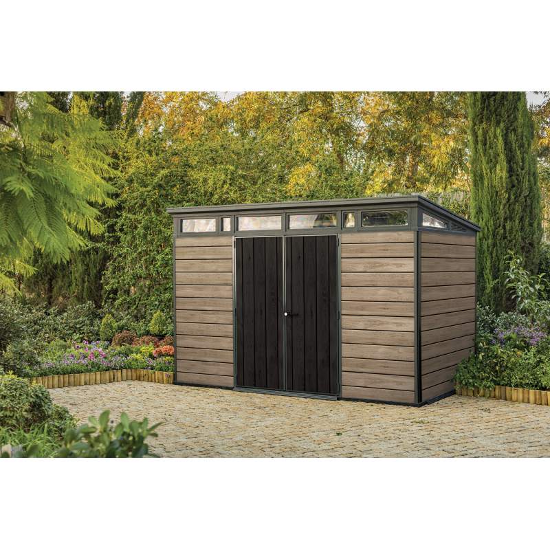Сарай - PENT 11X7 современен во всех отношениях. С наклонной крышей над оконной группой, он может похвастаться элегантным и привлекающим внимание дизайном. Внутри может быть расположено все: от рабочей зоны для обустройства дома до спортивного инвентаря на оборудования. PENT 9X7 изготовлен по уникальной технологии DECOCOAT, которая не только устойчива к погодным условиям, но и дополняет внешний вид и соответствует трендам дизайна открытого пространства лучше, чем любая другая технология. Технология DECOCOAT «Like wood, but better» (“Как дерево, только лучше») сочетает в себе преимущества смолистых веществ с эстетичной отделкой. Сарай, в высшей степени современный и прочный, полностью устойчив к атмосферным воздействиям и не требует дополнительного технического обслуживания – материал изделия не ржавеет, не гниет и не расслаивается.