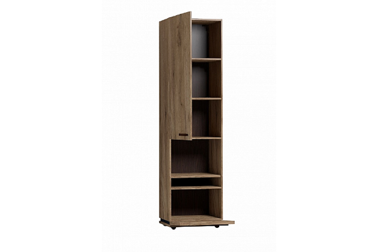 Благородный древесный оттенок шкафа, контрастирующий с черными ручками из массива дерева, подойдет к большинству цветовых решений – мебель будет легко комбинировать с другими предметами. Высокий шкаф МЦН удобен своей функциональностью и эргономичностью конструкции. На открытой полке разместите фотографии или элементы декора, а за глухими фасадами спрячьте документы и ценные вещи от посторонних глаз. Регулируемые опоры шкафа позволят компенсировать незначительные неровности пола. Декор Корпуса и Фасадов - Дуб Табачный, декоративные вставки – Черный. Особенности полки регулируемые по высоте крепится на стену за подвесы левосторонняя и правосторонняя сборка регулируемые опоры ручки из массива дерева сборный фасад ударопрочная кромка ПВХ 2 мм ручки из массива березы