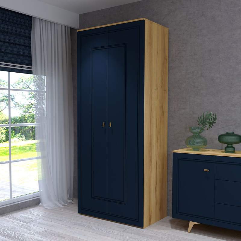 Шкаф распашной Вега Сапфир – стильное и функциональное решение для современной спальни. Сочетание строгих линий, сдержанного декора и яркое цветовое оформление делают образ шкафа невероятно эффектным.Шкаф для одежды выпускается в двух исполнениях: дуб золотистый + синий софт; дуб золотистый + глянец белый. Поверхность фасадов в синем исполнении – невероятно приятная на ощупь с эффектом soft touch. Глубокий синий цвет станет украшением интерьера спальни. Шкаф в белом исполнении с белыми глянцевыми фасадами добавит интерьеру света и тепла.Шкаф для одежды оснащен штангой для вертикального хранения одежды и широкими полками для обуви, головных уборов и прочих вещей. Шкаф в гостиную оснащен надежной фурнитурой, что служит гарантией долгой службы мебели. Петли с доводчиками обеспечивают плавное и бесшумное закрывание дверок шкафа двухдверного.
