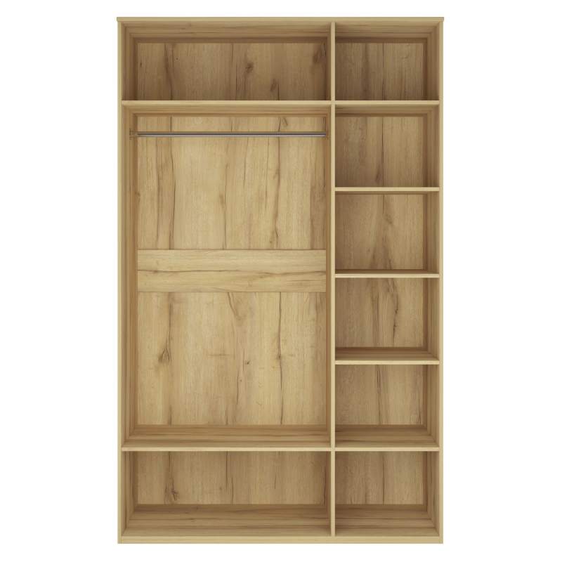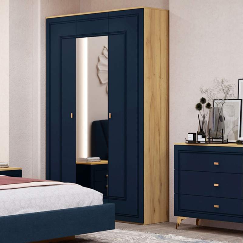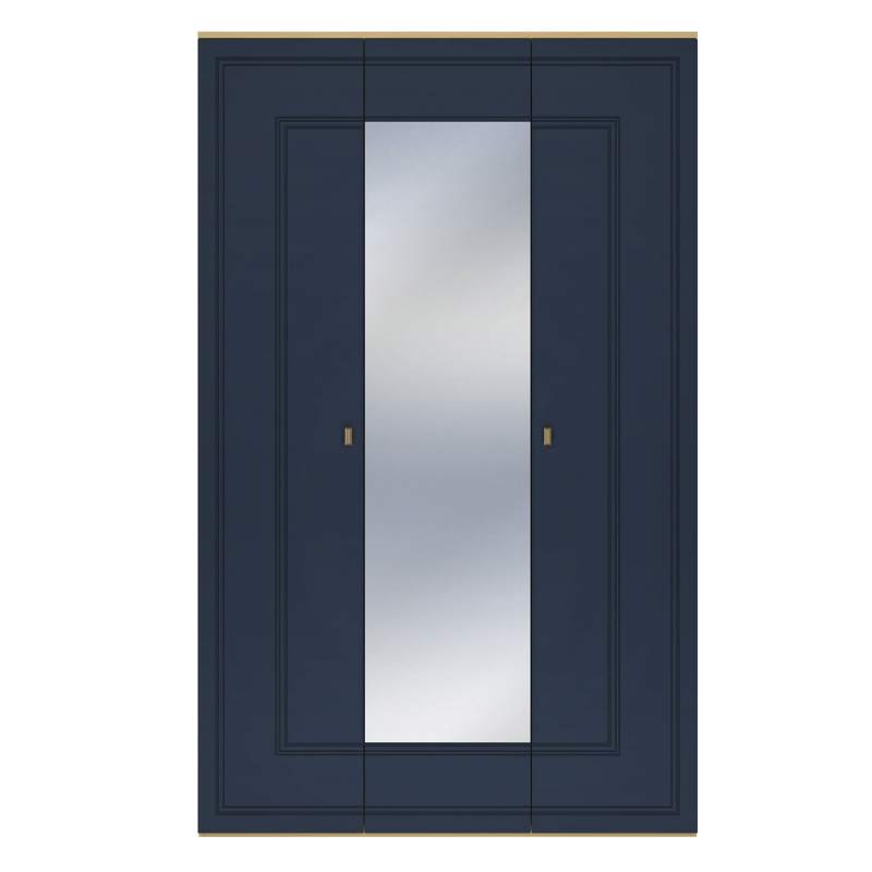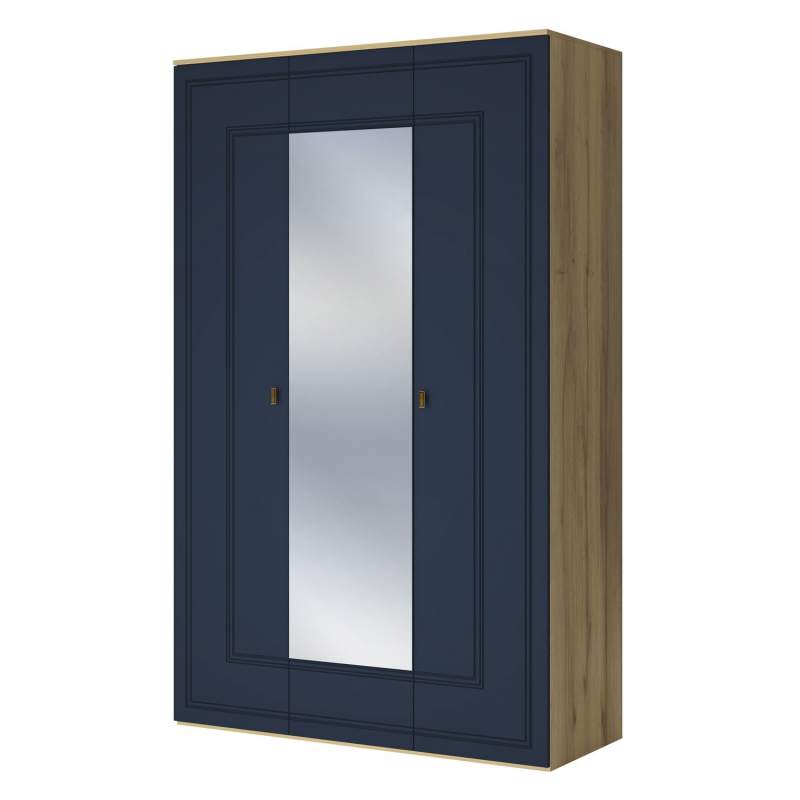 Шкаф распашной Вега Сапфир – стильное и функциональное решение для современной спальни. Сочетание строгих линий, сдержанного декора и яркое цветовое оформление делают образ шкафа невероятно эффектным.Шкаф для одежды выпускается в двух исполнениях: дуб золотистый + синий софт; дуб золотистый + глянец белый. Поверхность фасадов в синем исполнении – невероятно приятная на ощупь с эффектом soft touch. Глубокий синий цвет станет украшением интерьера спальни. Шкаф в белом исполнении с белыми глянцевыми фасадами добавит интерьеру света и тепла.Шкаф для одежды оснащен штангой и полками для хранения. Шкаф трехдверный комплектуется глухими и зеркальным фасадом. Материал фасадов – МДФ в пленке ПВХ – глянцевой или матовой в зависимости от исполнения. Наличие зеркала добавит комнате света и визуально расширит пространство.