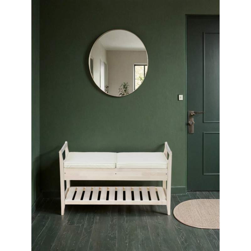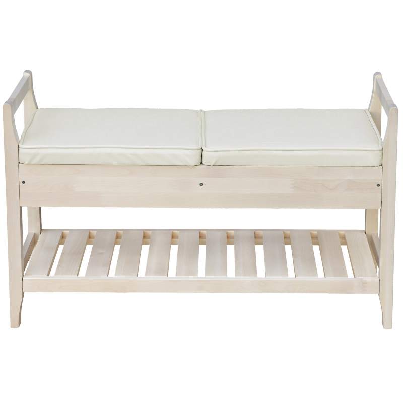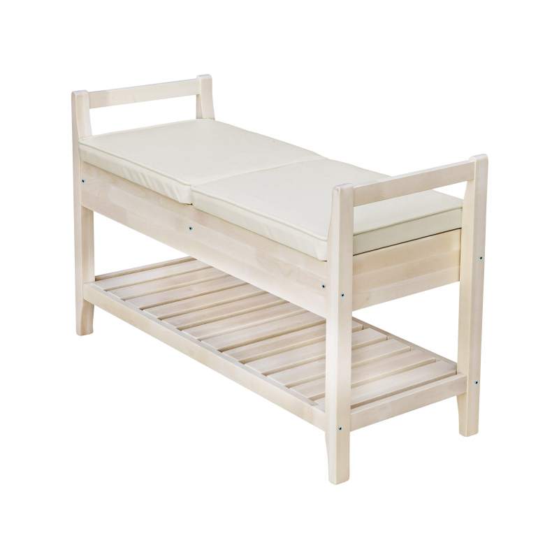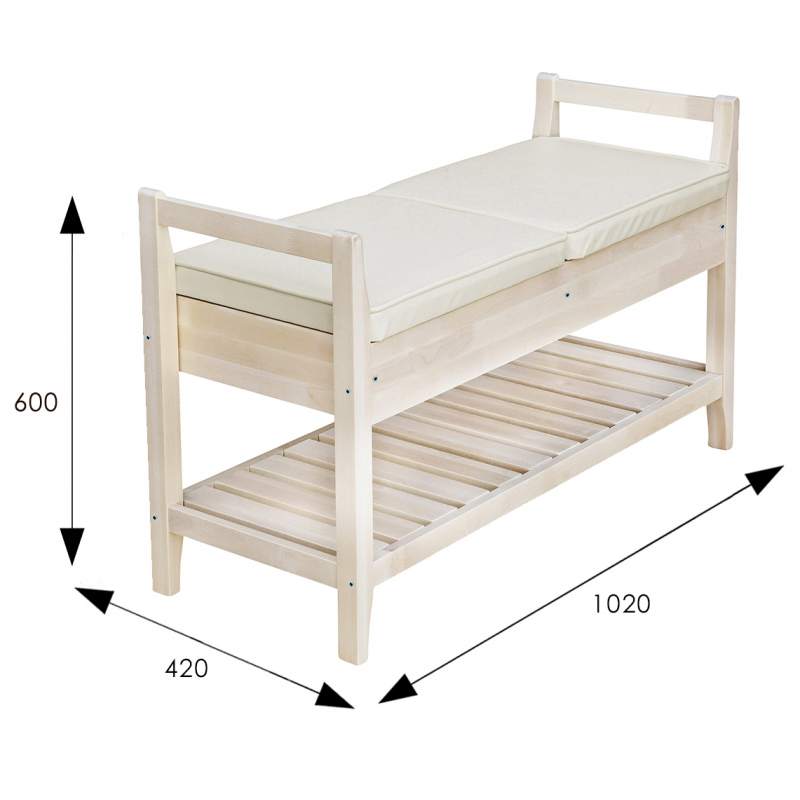 Компактное место хранения в прихожую в квартиру или на дачу. Скамья дополнена мягким сиденьем. Под сиденьем есть довольно вместительный ящик для хозяйственных мелочей. Кроме того, полка из ламелей предназначена для хранения нескольких пар обуви. Каркас изготовлен из массива дерева, что делает его легким и прочным, а также поддающимся реставрации в случае необходимости. Подлокотники не только ограничивают посадочное место, создавая некоторое ощущение посадки в кресле, но и являются ручками, за которые скамью легко переносить с места на место. Поставляется в разобранном виде, легко транспортируется и собирается. Рациональная покупка.
