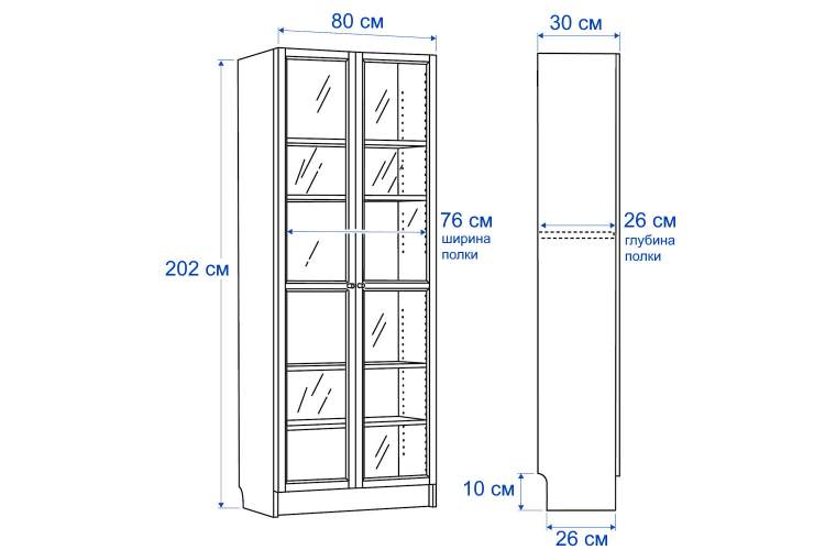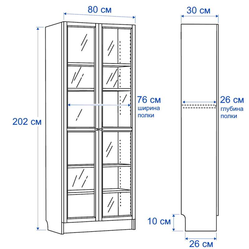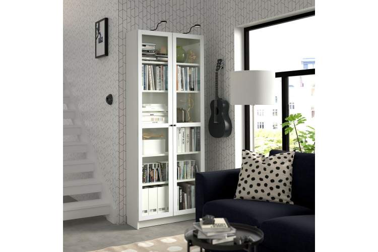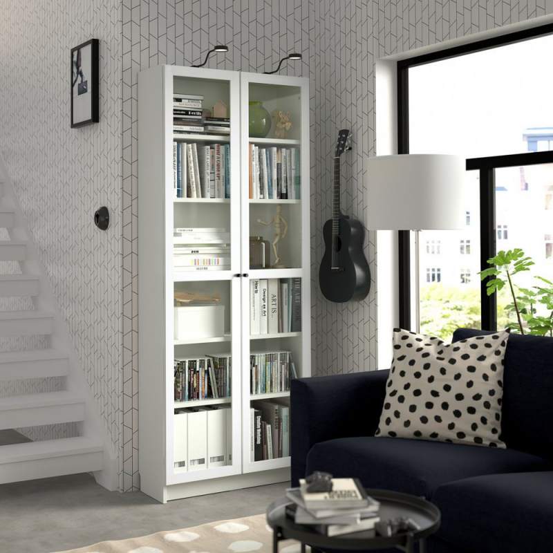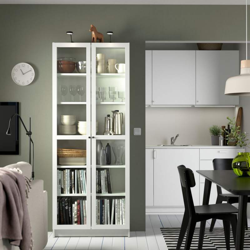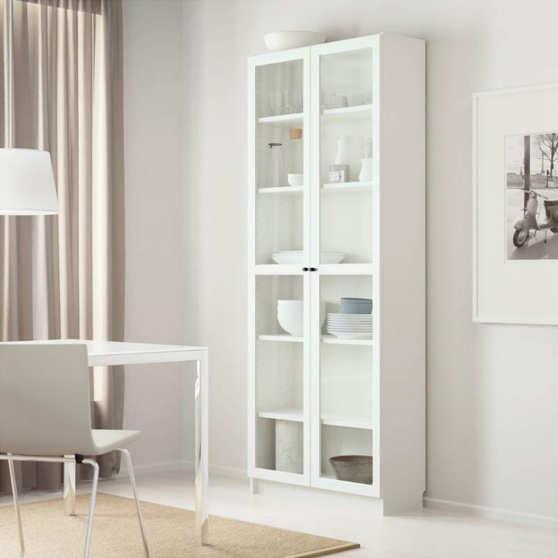 Шкаф-стеллаж со стеклянными дверцами "Билли" в стиле Икеа. Данная модель имеет компактные размеры, при этом довольно вместительна. На полках можно разместить коллекцию книг, посуду, игрушки, памятные вещи, награды. Благодаря дверцам хранимые предметы защищены от пыли и влаги.