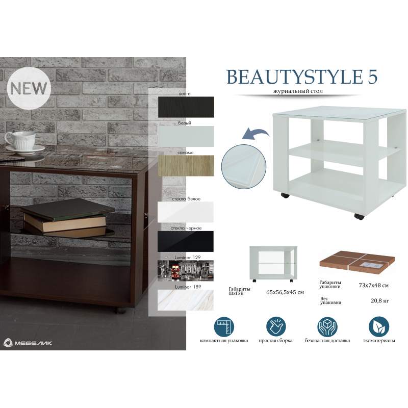 Журнальный стол Beauty Style 5 – более крупный вариант модели Beauty Style 6, который заслуженно является лидером продаж среди столов этой серии. Если вы не слишком стеснены в площади, то лишние 20см точно не будут лишними. Большая поверхность стола и две очень вместительные полки позволят вам использовать этот стол не просто как место для хранения любимых журналов или книг, но и как сервировочный столик и даже как рабочий. Конечно, перевозить на этом столе предметы сервировки не нужно, но поставить коктейли и блюдо с канапе, или просто разместить на нем все, что необходимо для легкого завтрака – легко. Вы можете расположить на нем любимый ноутбук, и вам еще хватит места для чашечки кофе. Столик легко перемещать по комнате, благодаря колесикам, два из которых со стопором, что делает стол более устойчивым. Вы можете подобрать столик понравившегося вам цвета из множества сочетаний, которые есть в нашем ассортименте. Стол Beauty Style 5 – выбор рационального прагматичного человека, ценящего удобство и практичность.