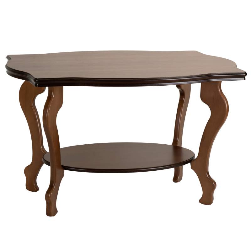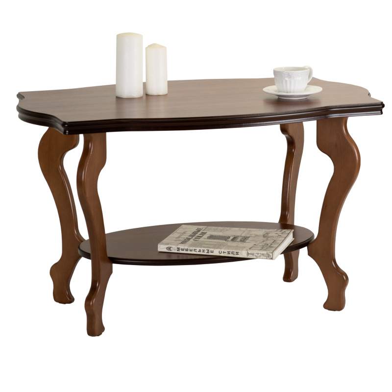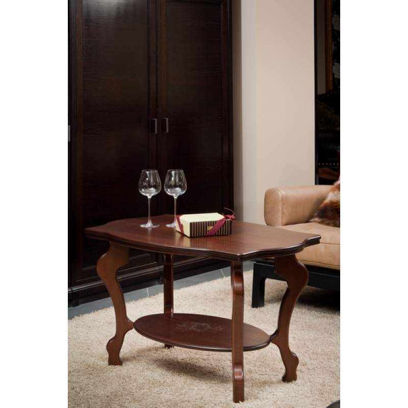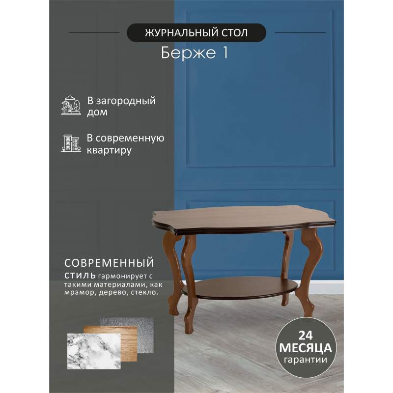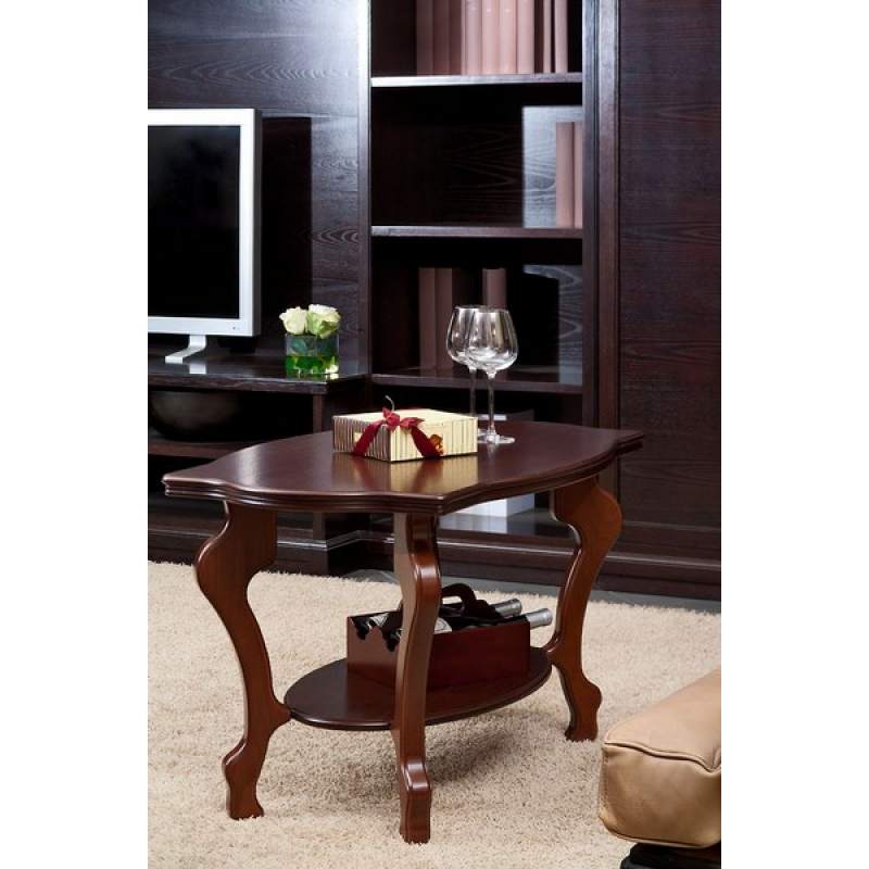 Журнальный столик Берже 1 выполнен в классическом стиле. Его ножки и рельефная кромка столешницы изящно изогнуты. Модель прекрасно дополнит традиционный дизайн дома или офиса.