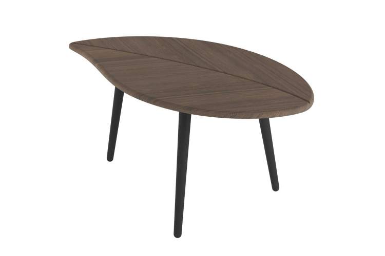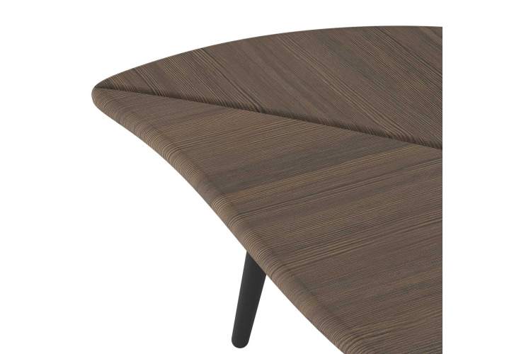 Особенностью журнального стола "Берли"является оригинальное сочетание фрезеровки столешницы в форме листа дерева и текстуры декоративного покрытия. Опоры выполнены из дерева.___