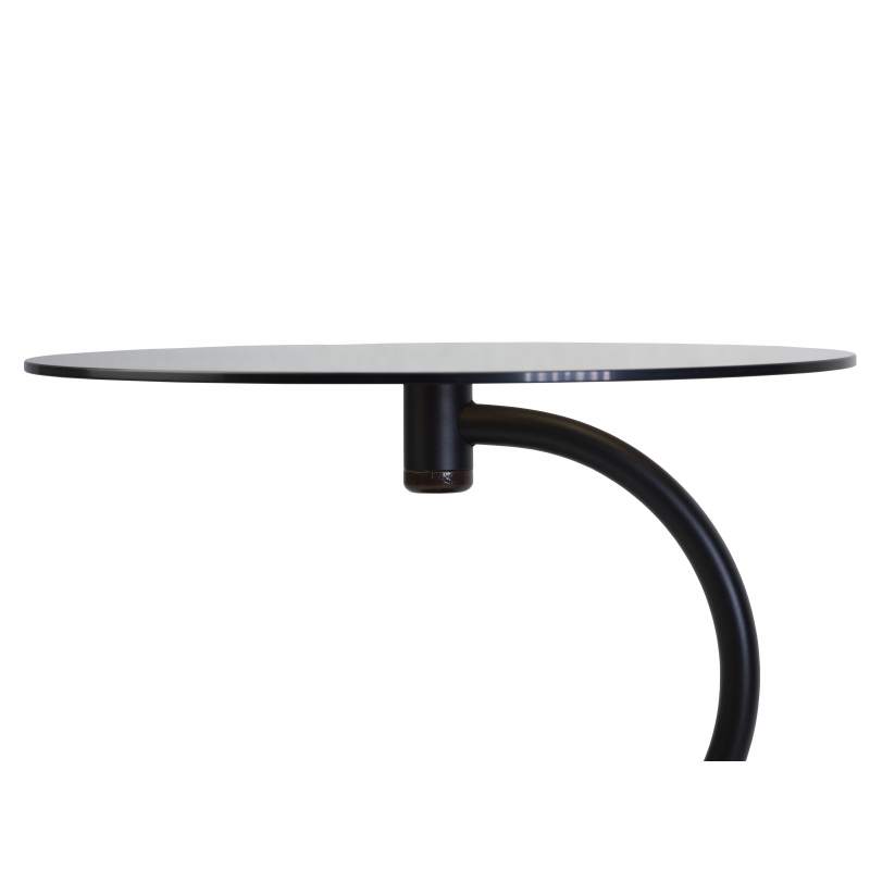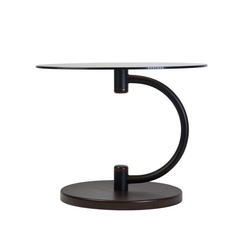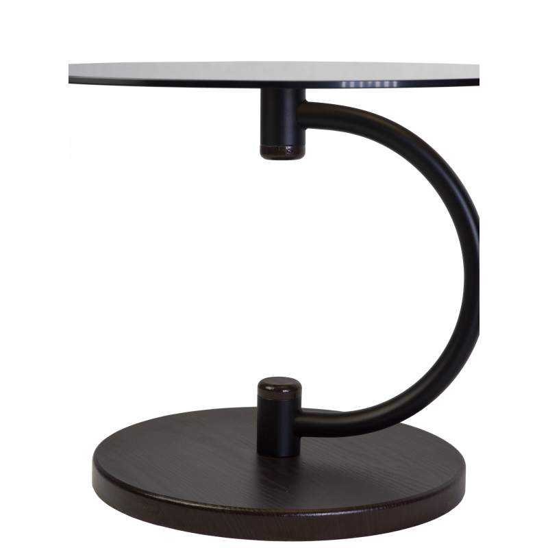 Небольшой, но массивный – вес 12кг! и устойчивый журнальный стол со стеклянной столешницей диаметром 58см, мощным основанием диаметром 42см из лмдф и опорой в виде полукруга идеально подойдет для оформления зон отдыха офисных и общественных помещений, современных частных интерьеров.