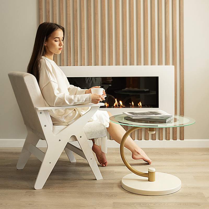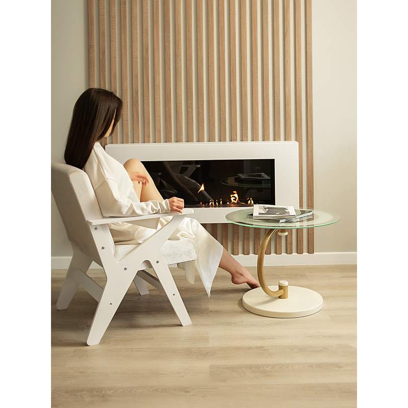 Небольшой, но массивный – вес 12кг! и устойчивый журнальный стол со стеклянной столешницей диаметром 58см, мощным основанием диаметром 42см из лмдф и опорой в виде полукруга идеально подойдет для оформления зон отдыха офисных и общественных помещений, современных частных интерьеров.