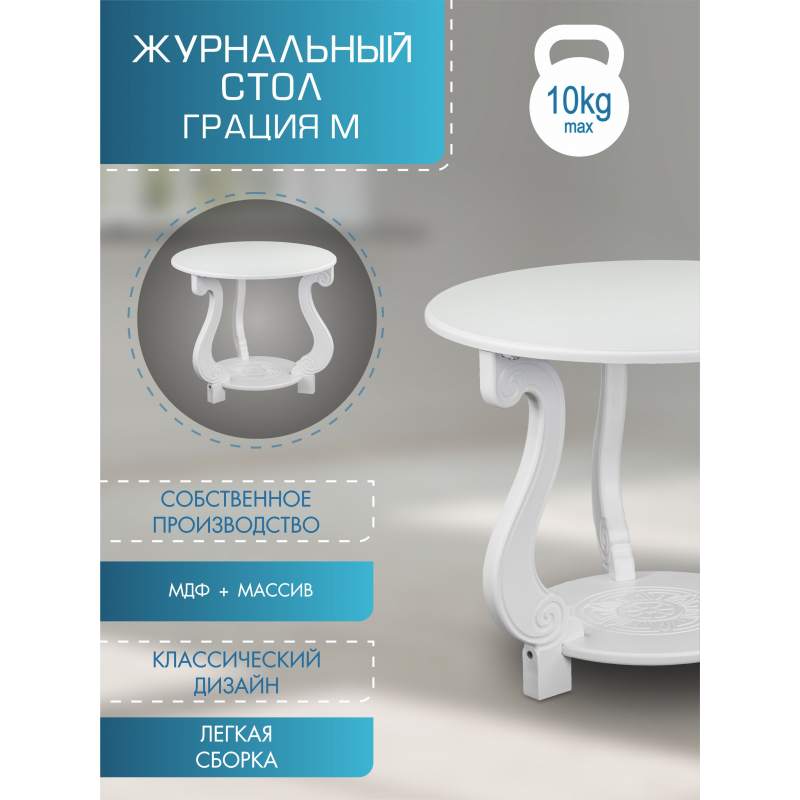 Журнальный стол Грация М Лайт — идеальное решение для вашего дома, подходящее для любого интерьера благодаря лаконичному дизайну и элегантным опорам. Стол сочетает эстетику и удобство. Круглая столешница добавляет легкости, а дополнительная полочка позволяет хранить аксессуары и журналы. Он идеально подходит для гостиной, спальни или офиса. Этот предмет мебели из прочного МДФ с эмалевым покрытием обеспечивает долговечность, а оригинальная гравировка придает современный стиль.