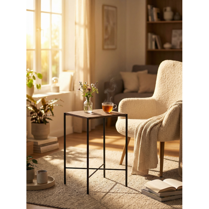 Металлические ножки с надёжной перекрёстной фиксацией не только создают модный индустриальный акцент, но и гарантируют абсолютную устойчивость. Этот стол станет вашим верным помощником в создании комфортной атмосферы — будь то уютный вечер с книгой или встреча с друзьями. Это идеальное сочетание стиля, качества и функциональности по доступной цене.