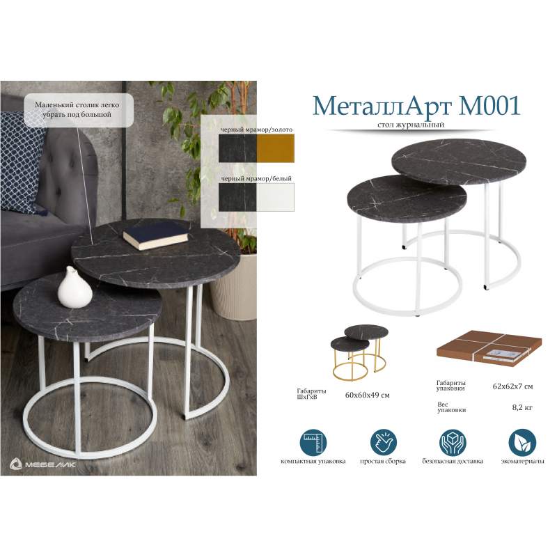 Приобрести Стол журнальный МеталлАрт М001 черный мрамор/белый в интернет-магазине недорого по цене 6659р.. Нажав кнопку ХОЧУ СКИДКУ - оператор предложит лучшую цену если это возможно. Доставка в Москве и области со сборкой сразу. Отправляем в регионы России. Для заказа Стол журнальный МеталлАрт М001 черный мрамор/белый 009485-09 009485 звоните по телефону: +7(495)642-45-92. Посмотреть Стол журнальный МеталлАрт М001 черный мрамор/белый от mebelik можно в каталоге.