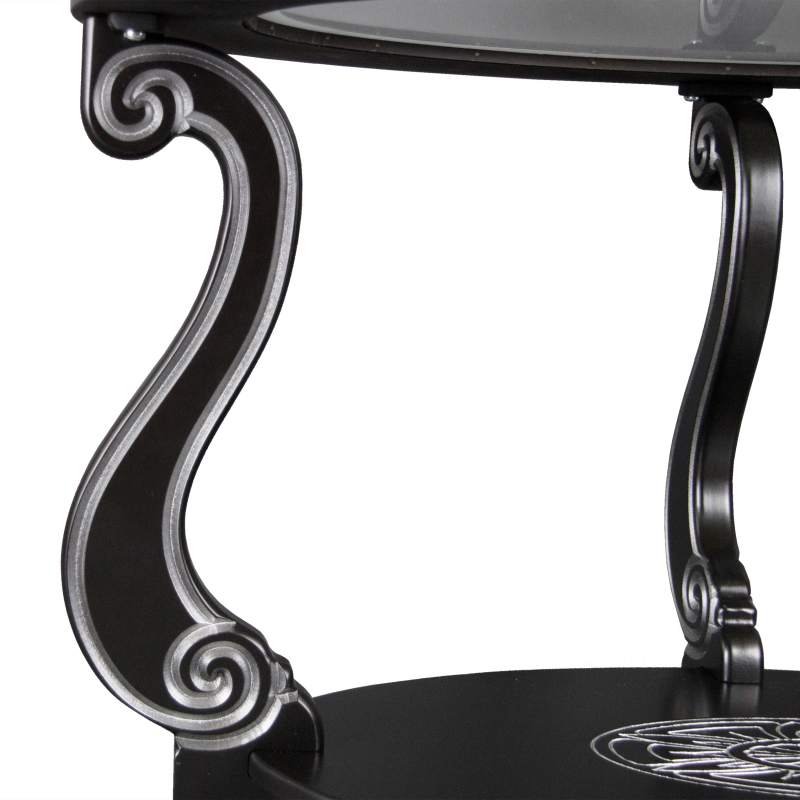Форма стекла перекликается с формой полочки, изящные ножки с резьбой
