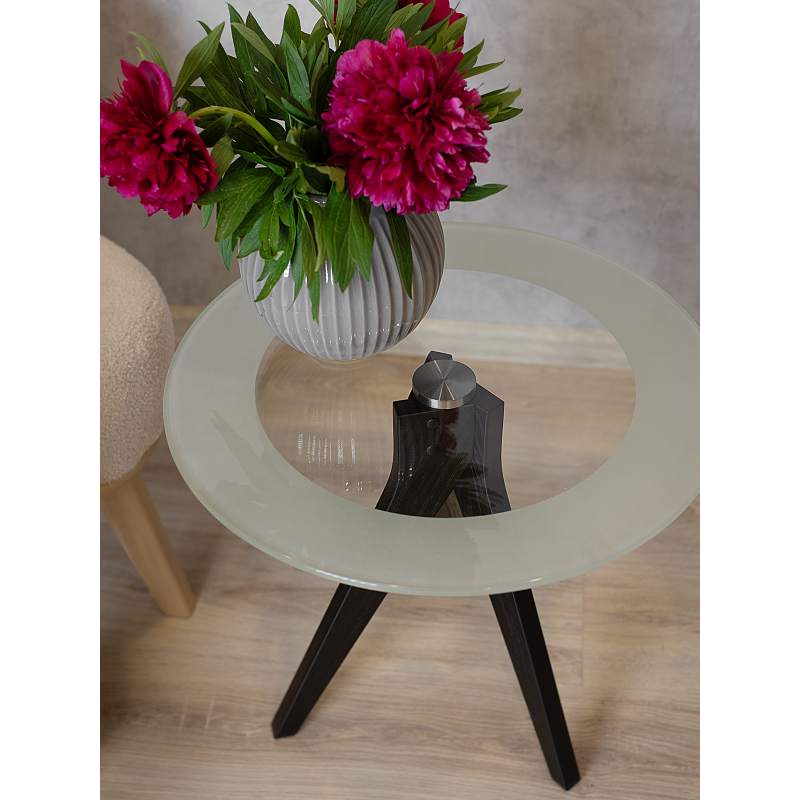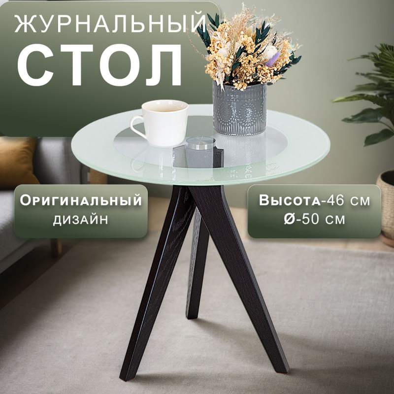 Журнальный столик Рилле 441 – это изящный и компактный предмет мебели, подходящий для любого интерьера от классики до лофта. Рилле 441 прекрасно справляется с ролью как журнального, так и прикроватного или придиванного столика. Опоры, выполненные из шпона берёзы (толщиной 24 мм), обеспечивают устойчивость, надёжность и долгую службу, а покрытие эмалью и тиснение с имитацией рисунка дерева придают столику естественную красоту. Обрамление круглой столешницы диаметром 500мм из стекла (8мм) пескоструйным рисунком шириной 80мм и минималистичный геометрический узор, который создают опоры, формой напоминающие бумеранг, подчеркнут уникальность любого интерьера.